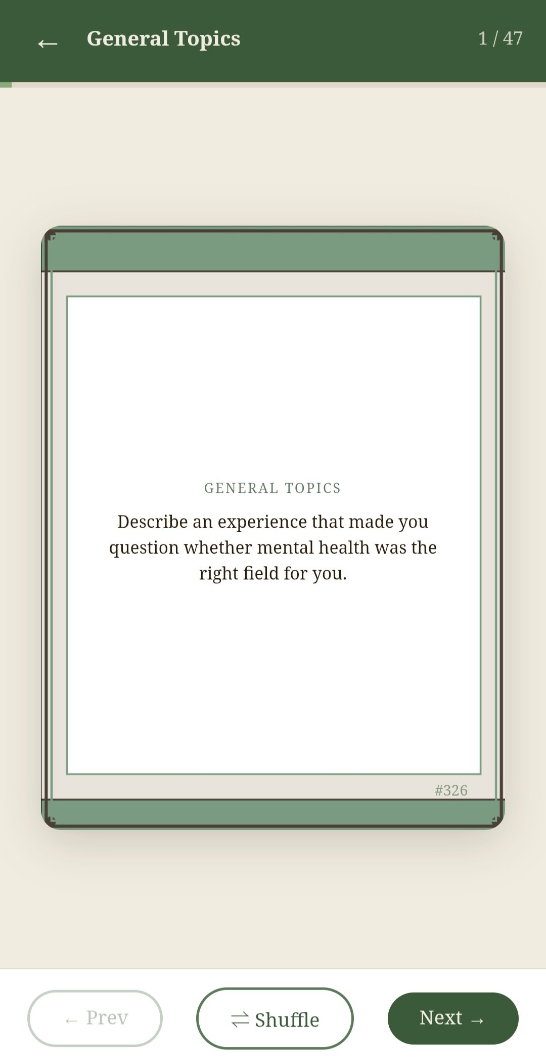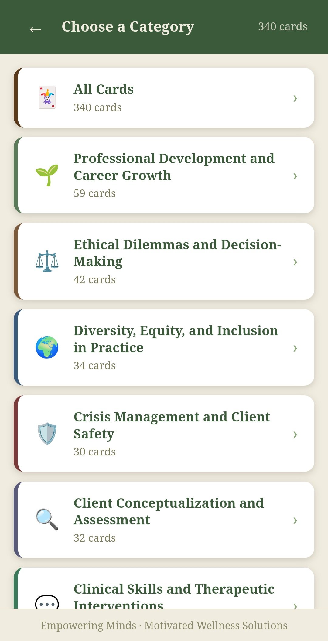 - Browse by category or draw a random card each session