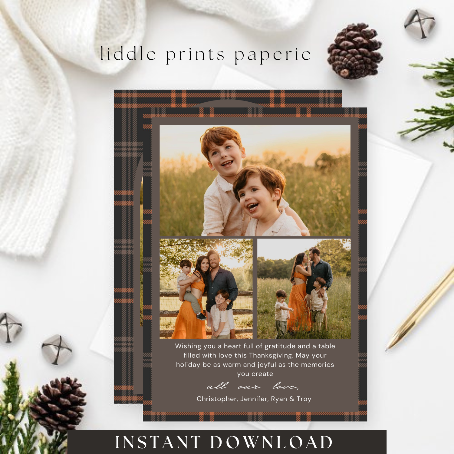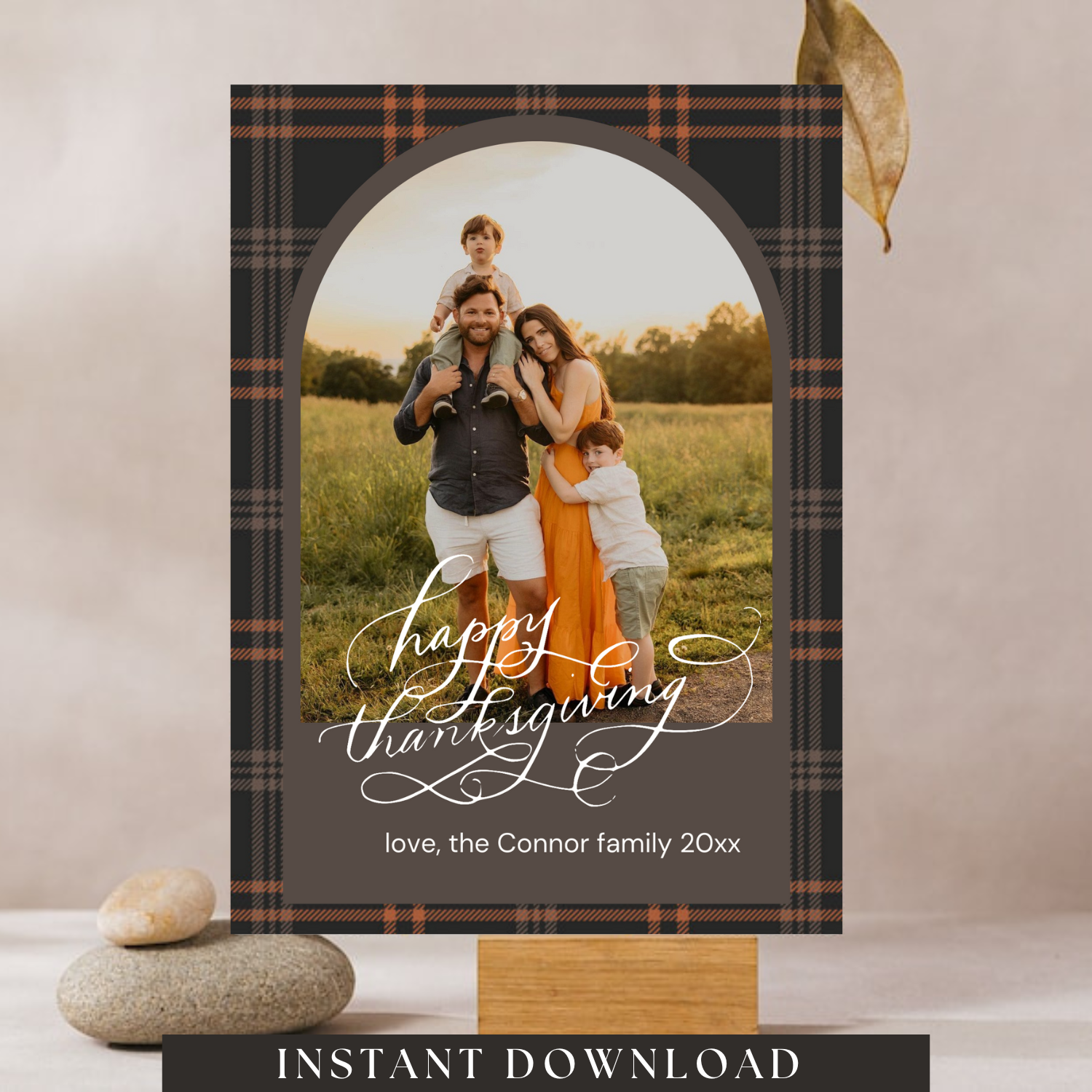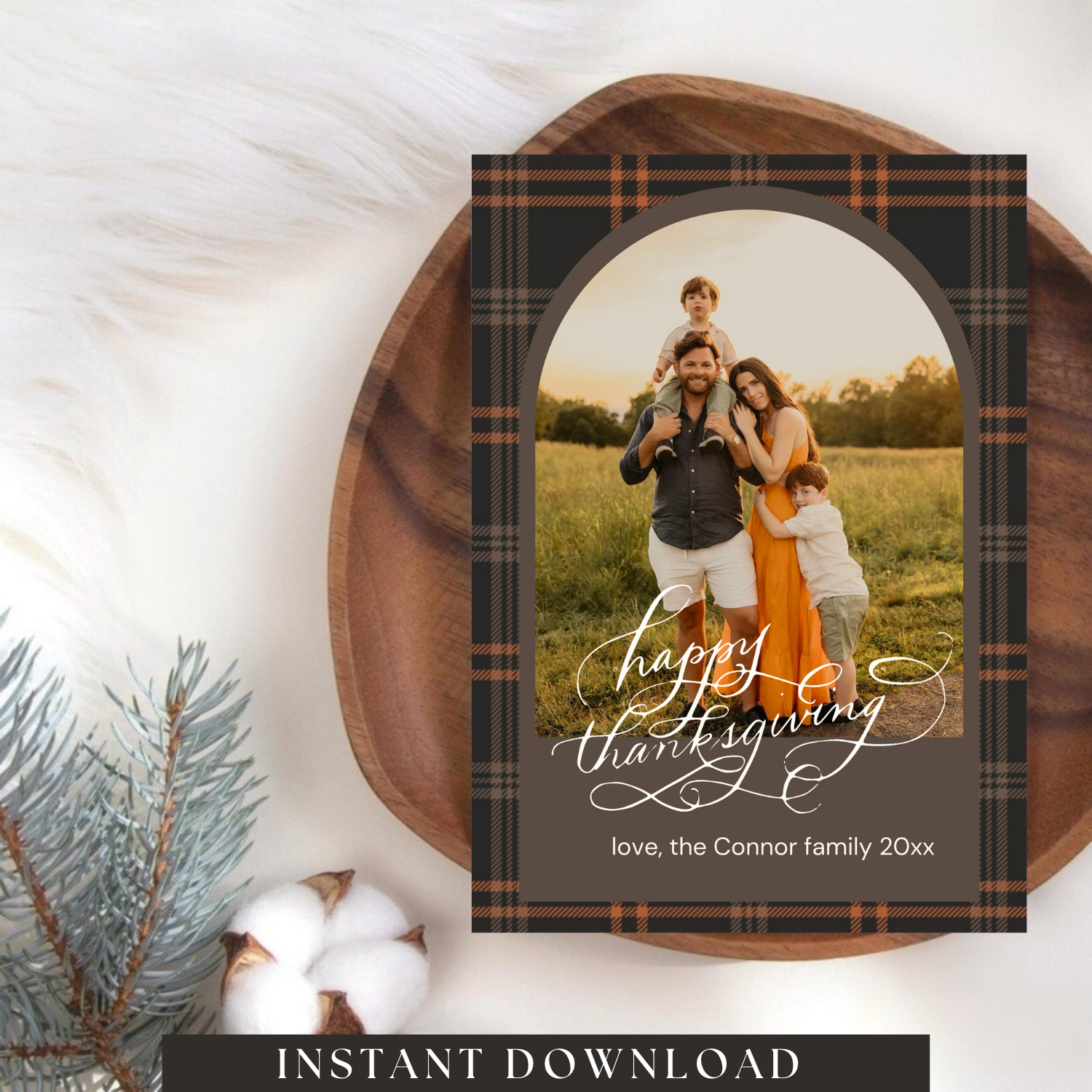 Ideal for: Thanksgiving cards, family holiday cards, boho-themed holiday cards, plaid Thanksgiving cards.