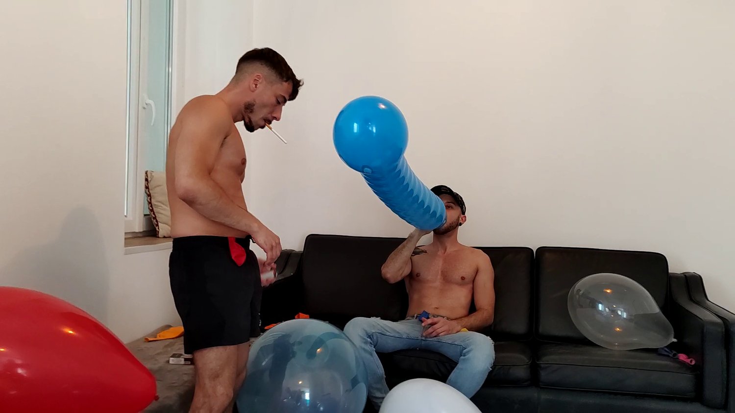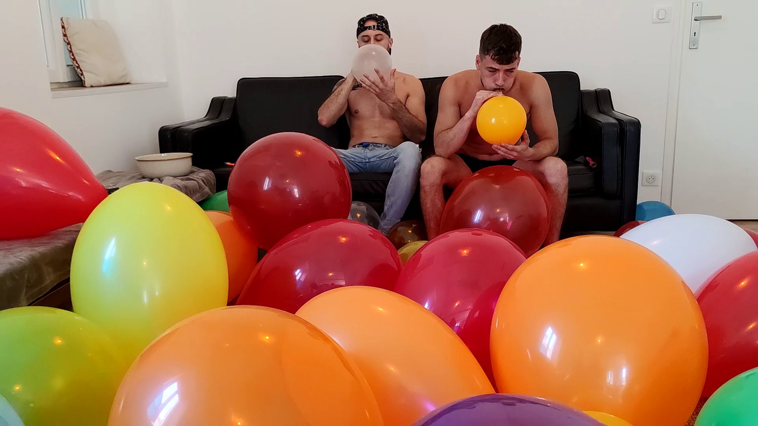 In this video they blow balloons, pop somme of them, let somme deflate and the burst all the balloons inflated in the room.