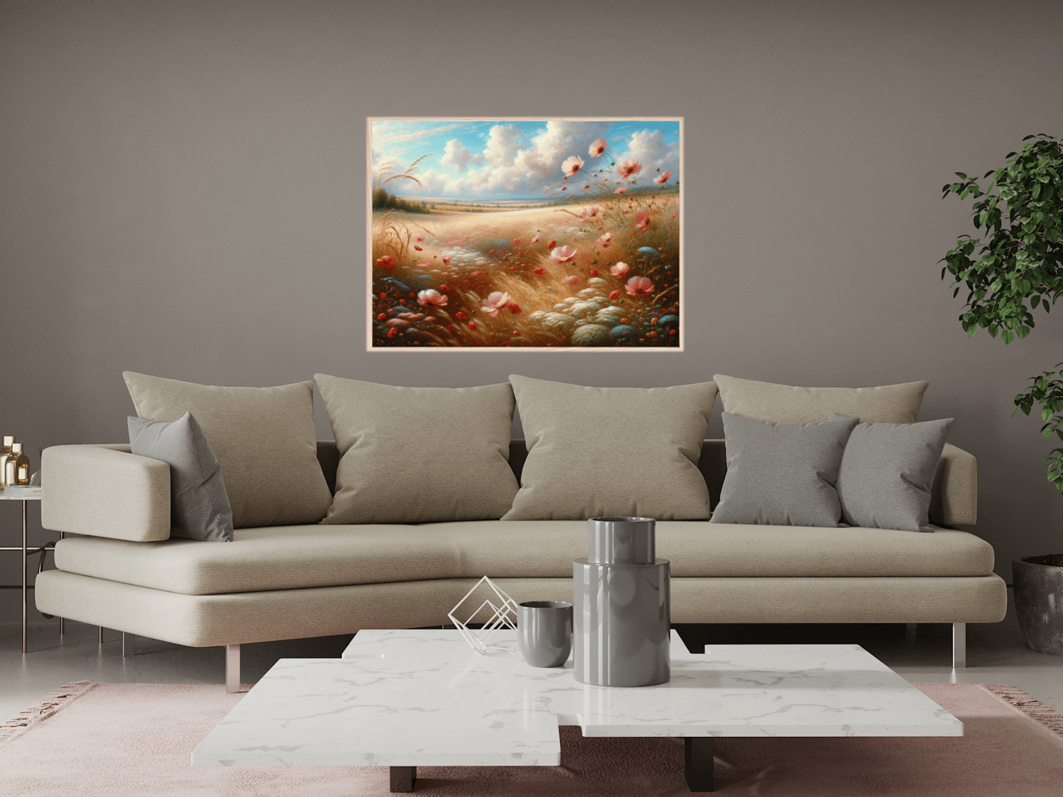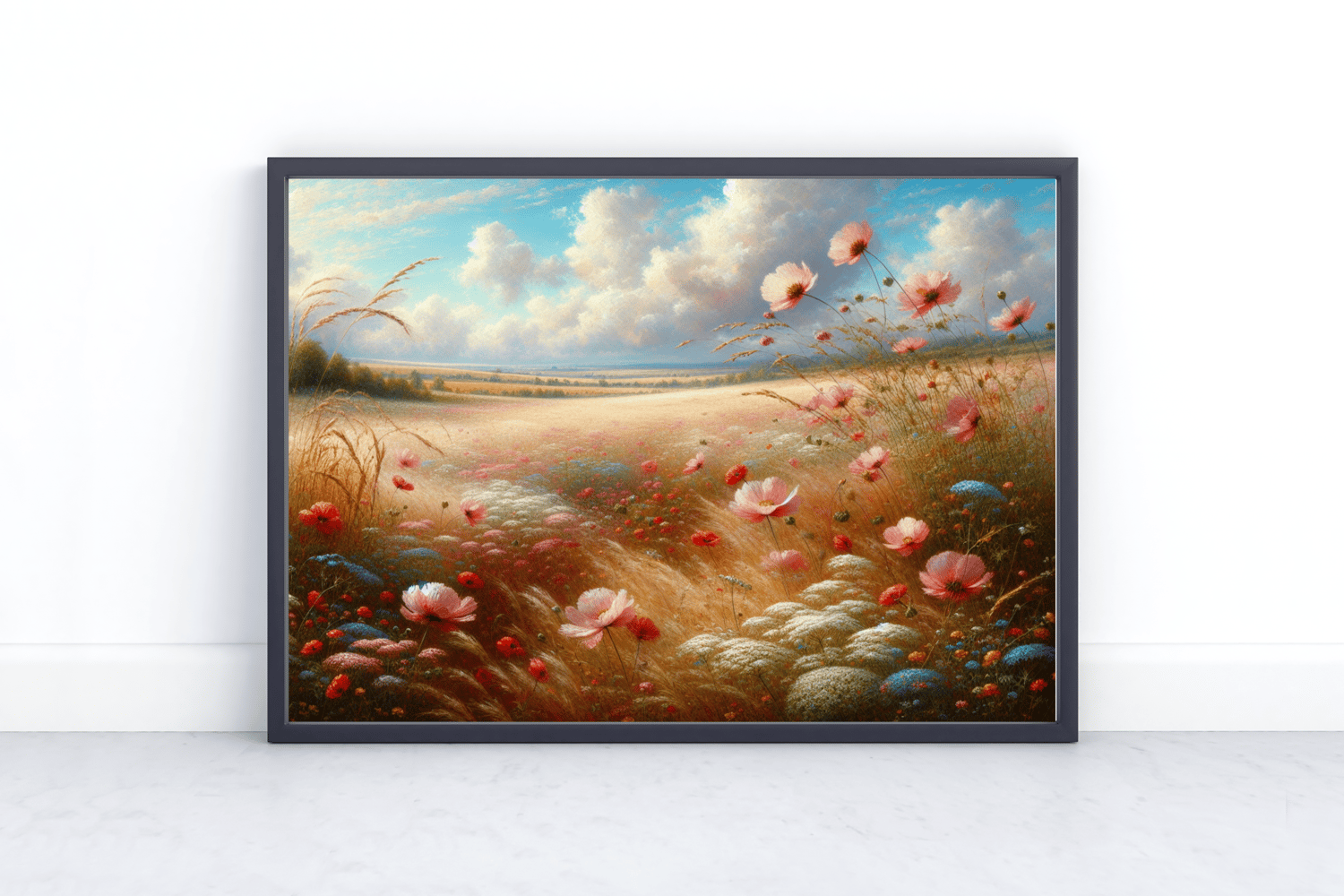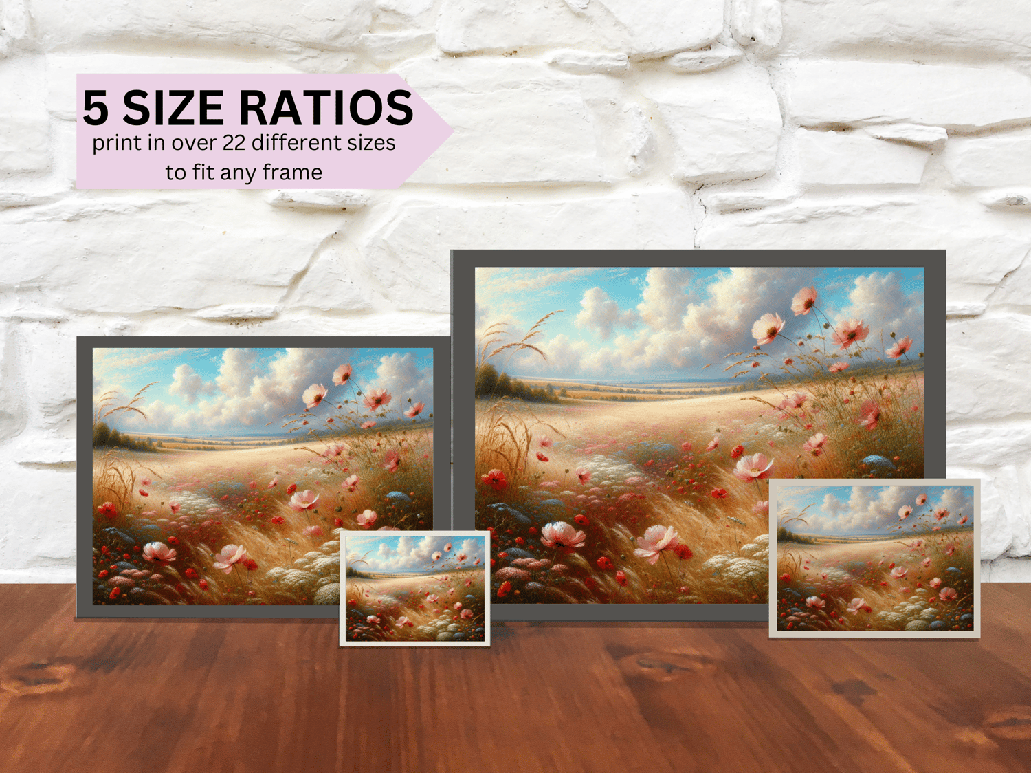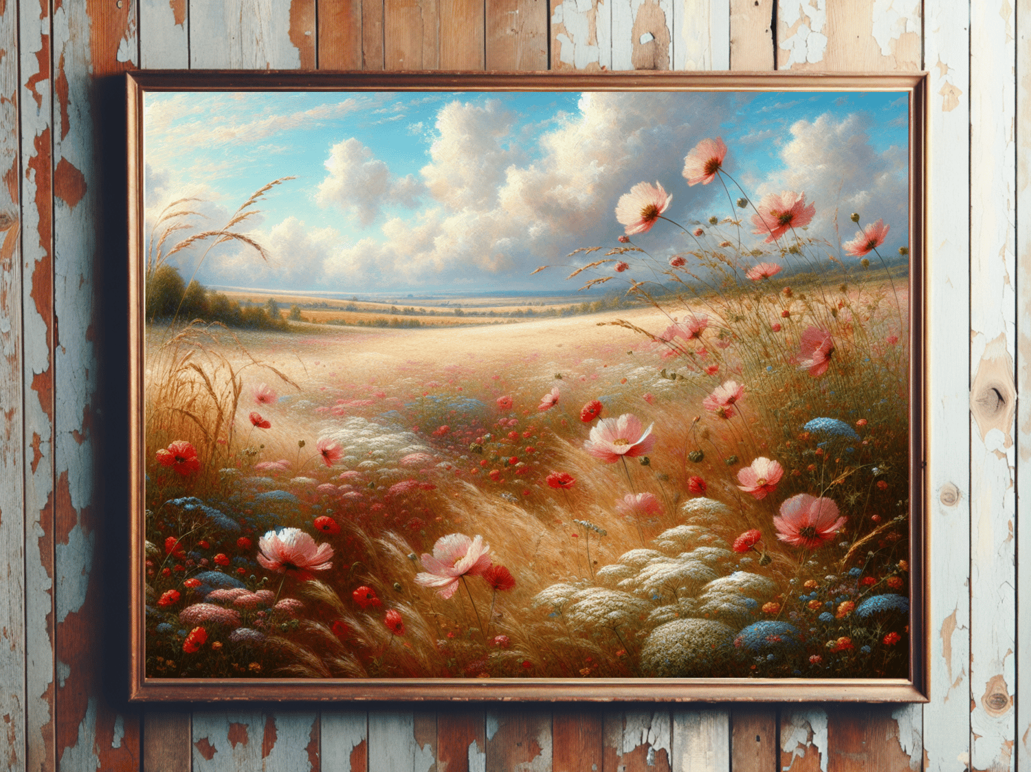 Colorful country wildflower poster in landscape. Printable poster in 5 size ratios making a beautiful nostalgic farmhouse vibe in your living room, dining room, entrance or bedroom. Crafted in an acrylic look featuring pink and blue wildflowers in a country field. This will match any furniture items due to the varied soft color palette.