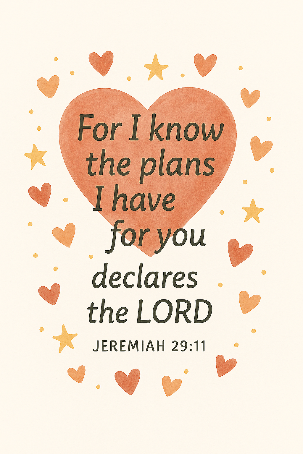 Celebrate divine purpose and hopeful futures with this Jeremiah 29:11 Scripture Poster, featuring a joyful design of hearts and stars surrounding God’s promise: