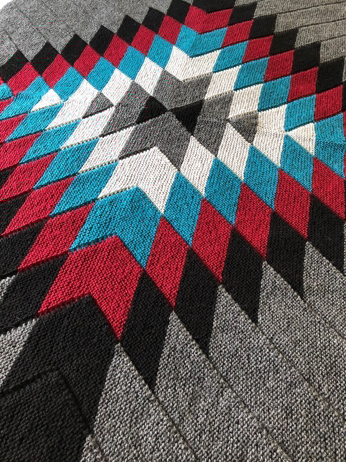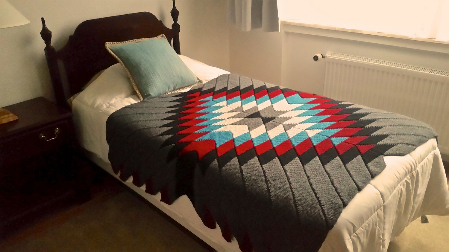 The blanket is a modular project that's worked in diagonal strips which are joined to the preceeding strip at they're worked. The rows are short, generally 12 to 30 sts, depending on blanket size. While there are a lot of colour changes, Instructions are included for minimizing the number of ends to weave in. The blanket is worked in garter stitch throughout.