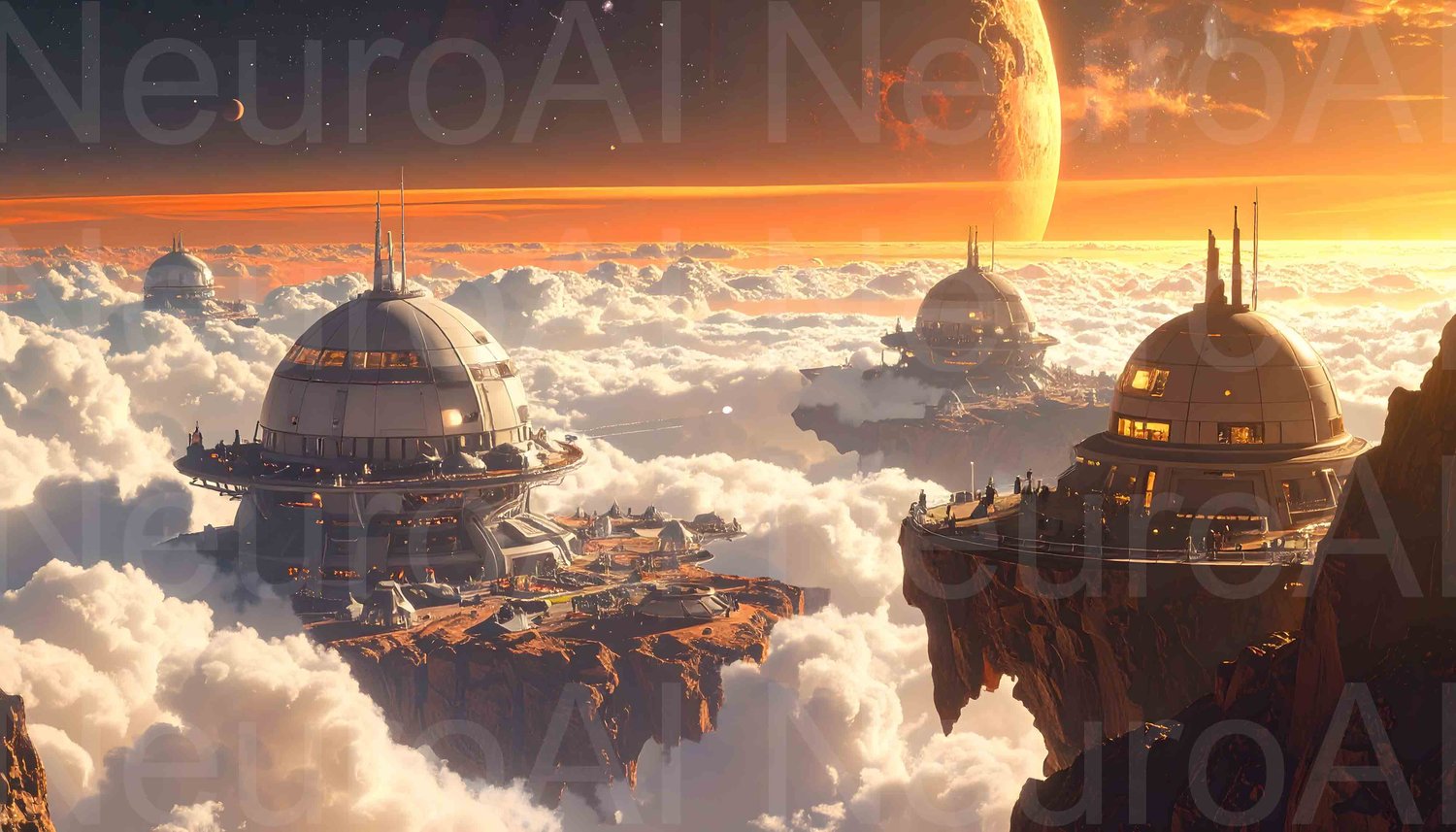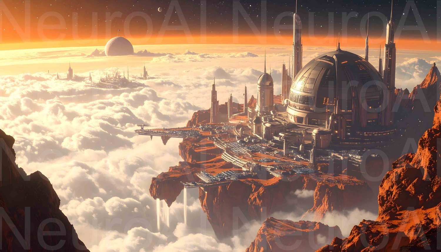 Dreamy futuristic city floating above clouds