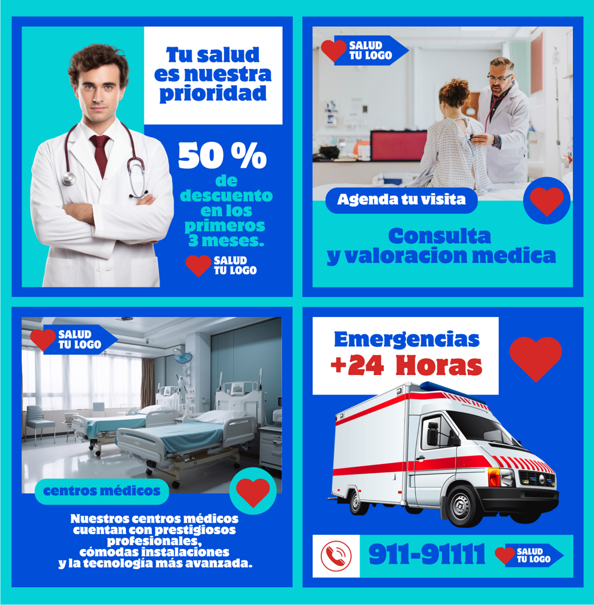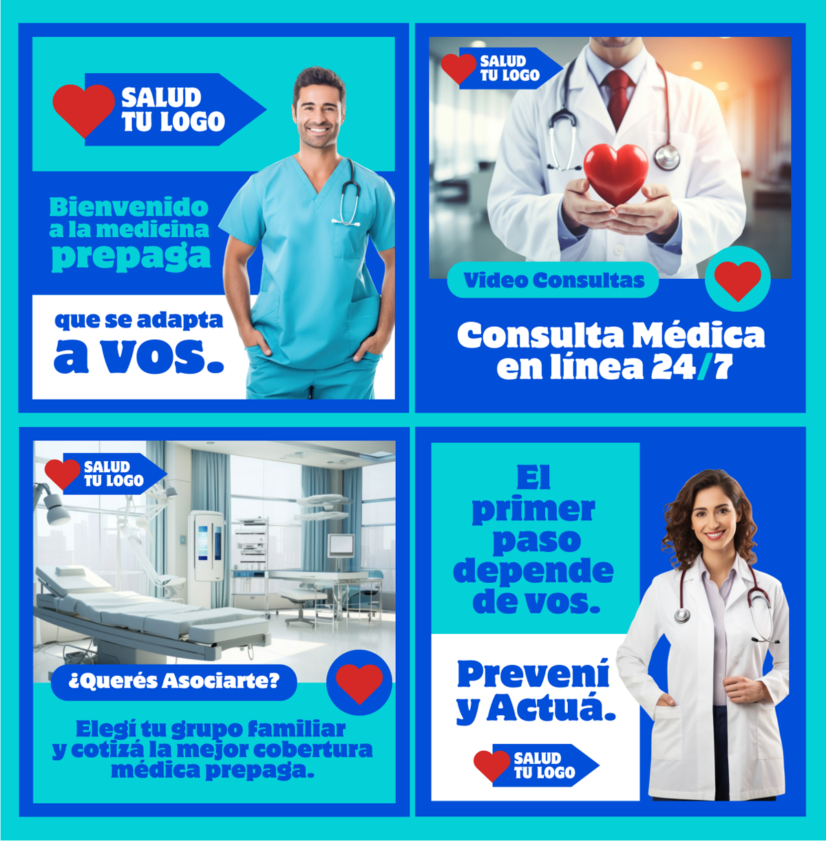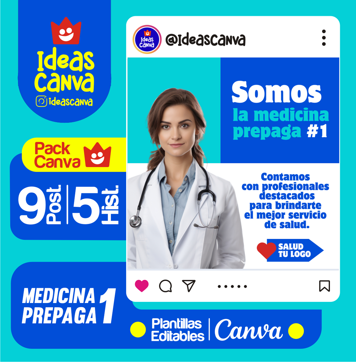 Plantilla Medicina Prepaga 1, diseño ideal para Salud / Medicina. Edita textos, colores, imágenes y elementos fácilmente adaptando estos diseños a la temática de tu emprendimiento / negocio usando nuestras plantillas para Canva.