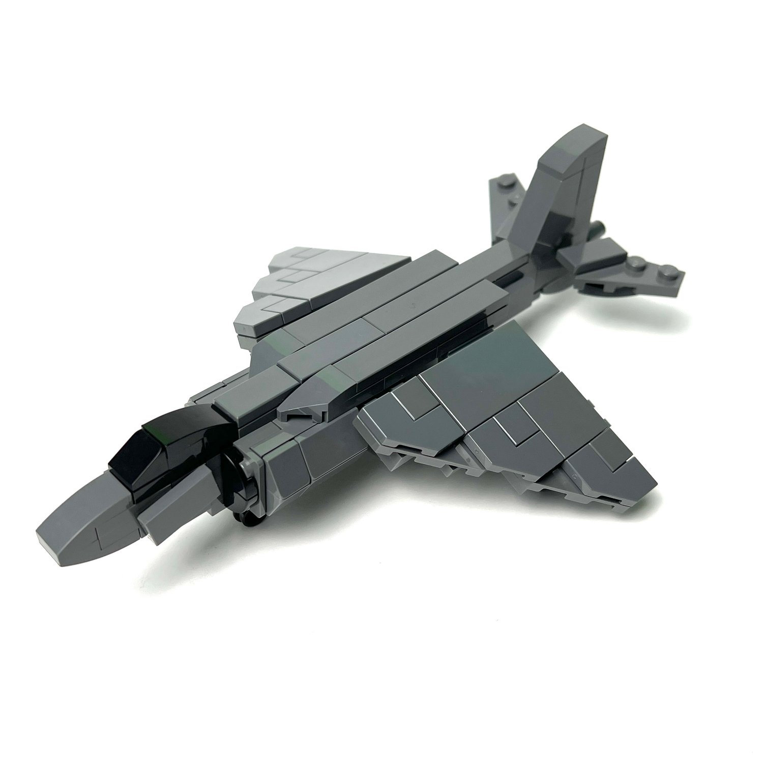 The Harrier II is a cool jump jet that is designed with canted wings and that was a challenge to make in this size. I also made the stabilizers slightly tilted like the real thing. You can fit 4-6 sidewinders/bombs on the underside of the wings.