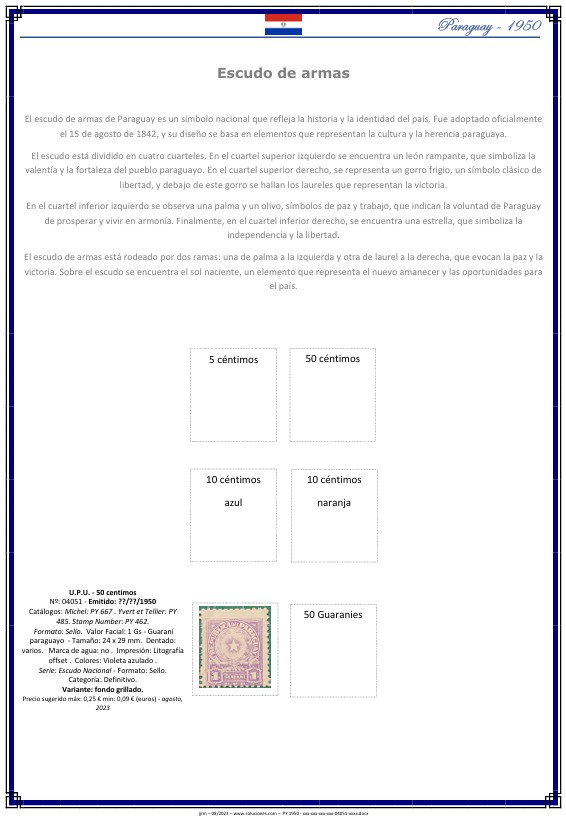 Ficha digital en formato PDF correspondiente a los sellos emitidos en Paraguay en 1950 dedicados al Escudo de Armas. Esta ficha incluye la pieza identificada en el Catálogo Sooluciones PY-1950-xxx-xxx-xxx-xxx-04051-xxxx, con información técnica detallada para su correcta clasificación dentro de una colección filatélica.