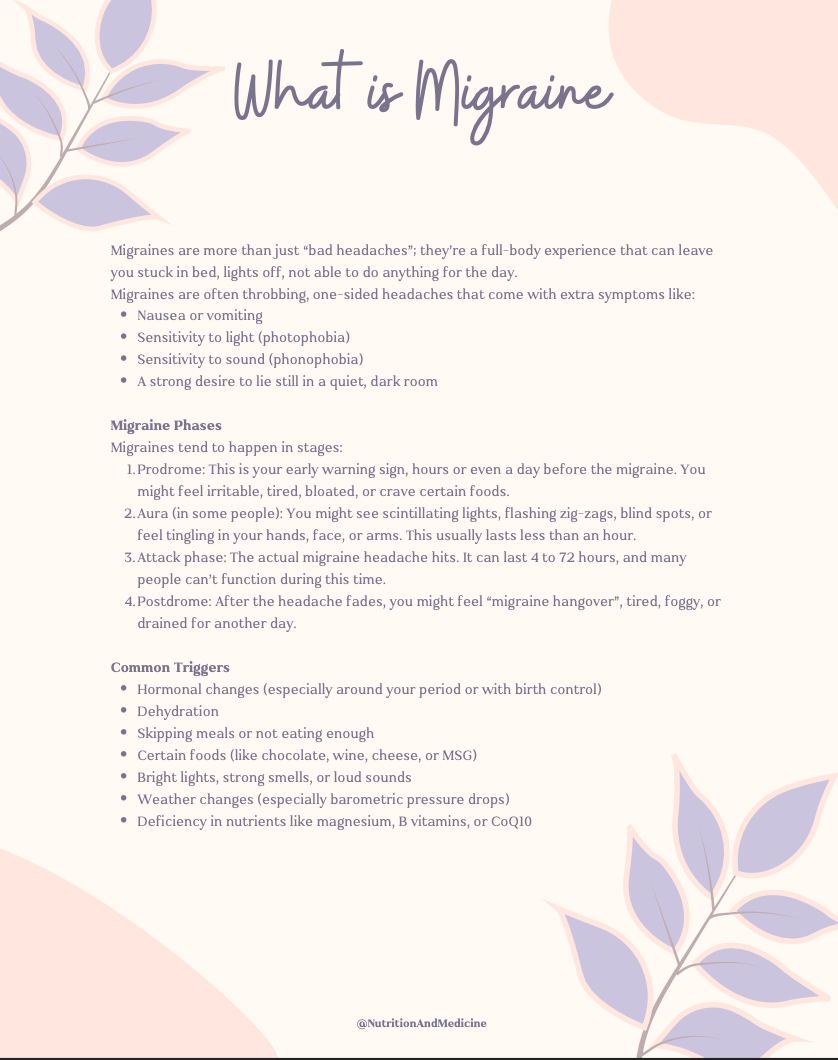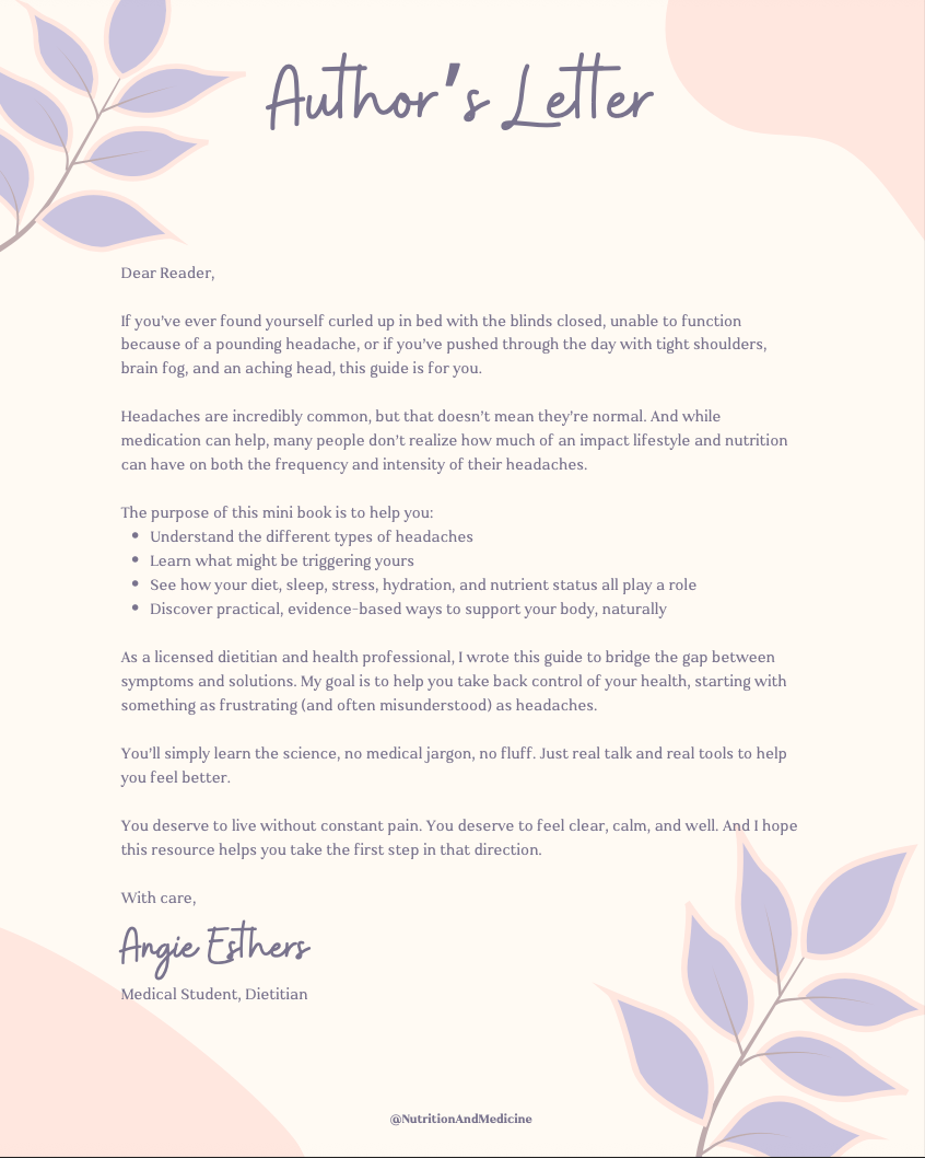 Tired of pushing through your day with a pounding head? This mini ebook, written by a licensed dietitian and medical student, gives you a clear, evidence-based approach to understanding and managing headaches, naturally.
