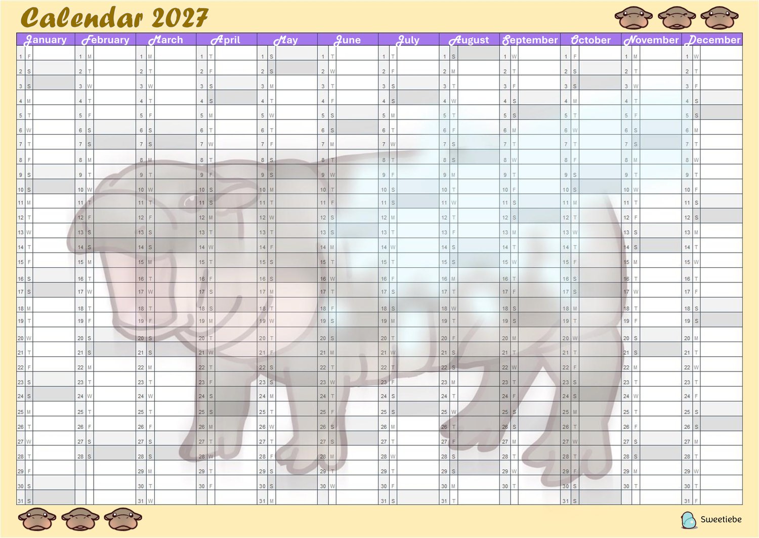 Happy Hippo Design 2027 Single Page Yearly Calendar Planner (Printable & PDF)