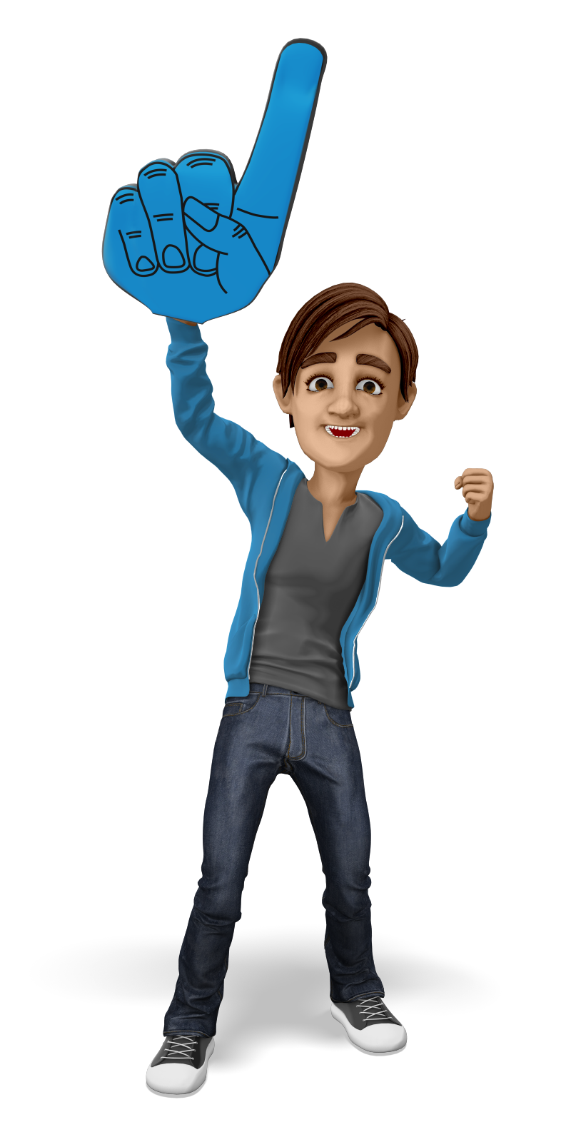 This clipart image features the presentation character Brad happily celebrating at a sporting event. Brad is raising his hand in celebration, while wearing a large foam finger on it. His other hand is clinched in a celebratory fist pump motion. Use this clipart image for all of your sporting or celebration needs.