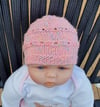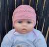 This 8ply Beanie is worked in an easy eyelet stitch and has a garter stitch brim. The photos show the 0 months size.