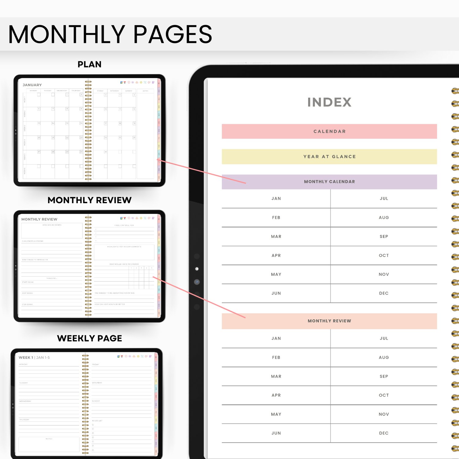 • Hyperlinked templates for yearly, monthly, weekly, and daily planning