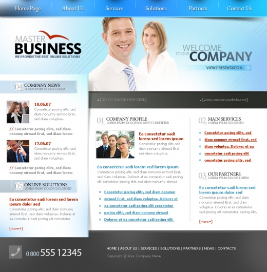 Launch your business's digital presence with the Master Business Website Template, featuring a polished blue-white color scheme. Ideal for corporate websites, this template includes fully customizable HTML, CSS, PSD, and JPEG files for seamless personalization. With sections like “Company Profile,”“Main Services,” and “Our Partners,” you can effectively showcase your expertise. The intuitive navigation menu enhances user experience, and the homepage welcomes visitors with a “View Presentation” button for impactful introductions. Perfect for companies aiming to provide innovative online solutions with elegance and clarity.