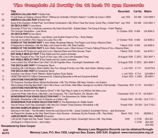 Al Bowlly wasn't featured on many 12 inch 78rpms but here are 17 releases where he was included. He appears with the bands of Ray Noble and Lew Stone. There are also one off records with John Watt's Songs of the Shows including a duet withg Elsie Carlisle. There are excerpts froma Jubilee Music Hall record and a record sampler made for playing in your local record shop to tempt you to buy. Fewer sides as obviously 12 inch records play longer than the standard 10 inch discs.