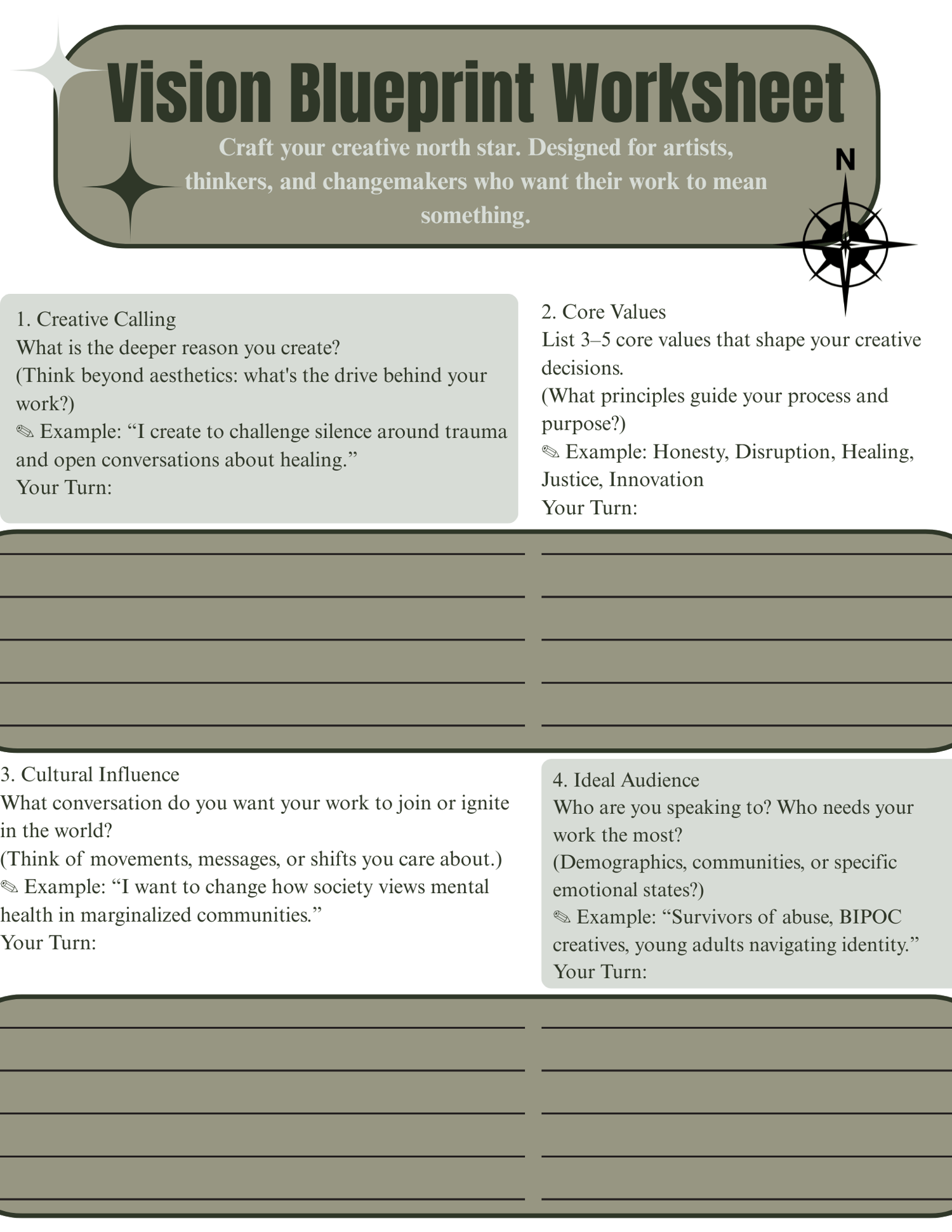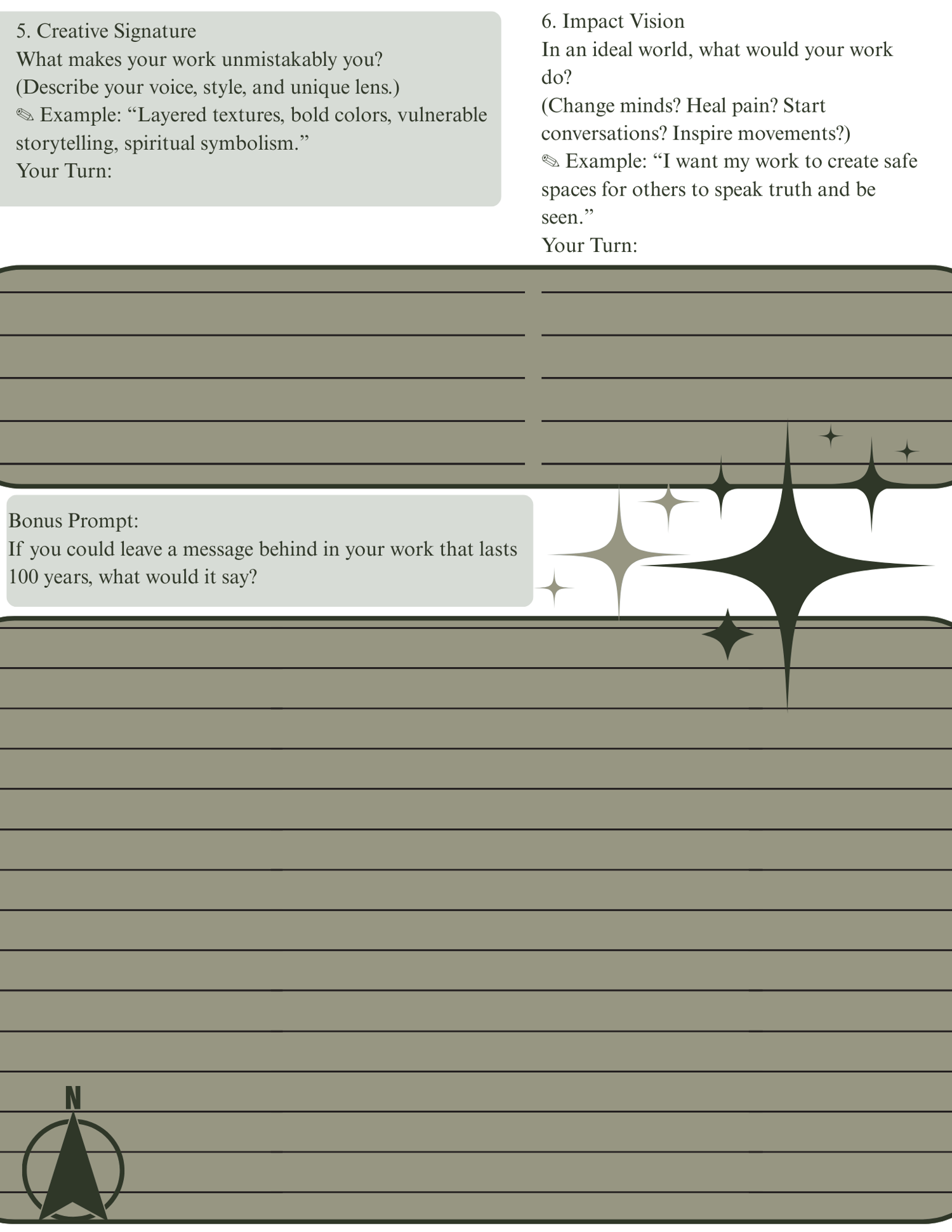 Craft your creative north star. Designed for artists, thinkers, and changemakers who want their work to mean something.