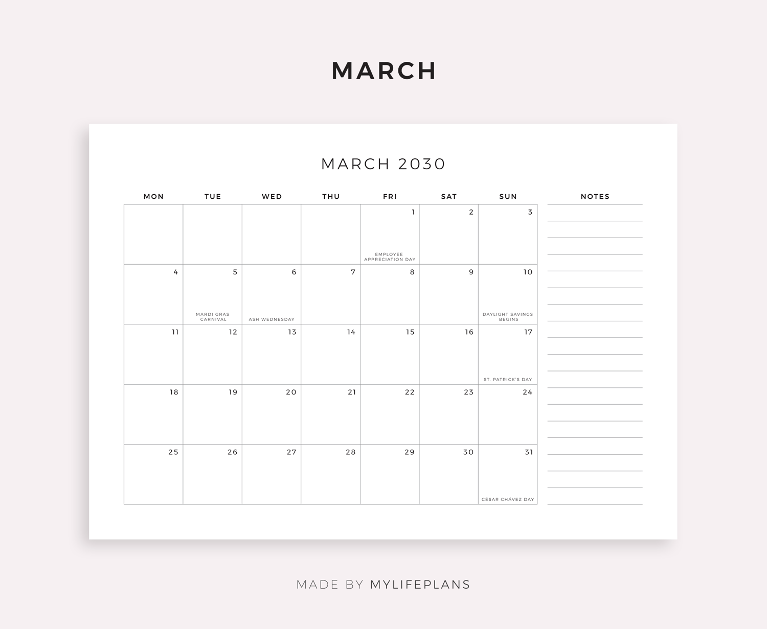 2030 Monthly Planner with Holidays, Landscape, Printable & Fillable, A4/Letter Size