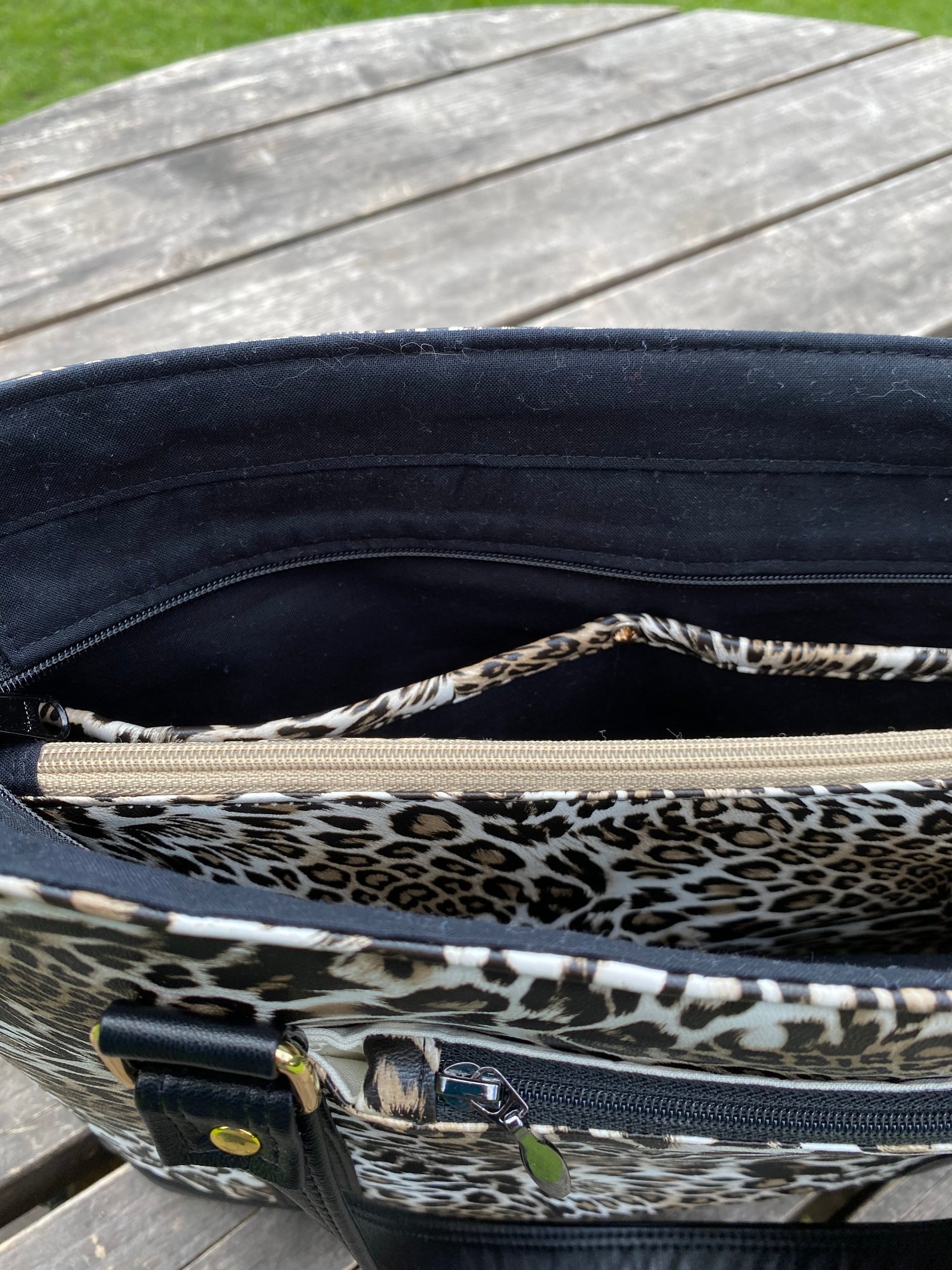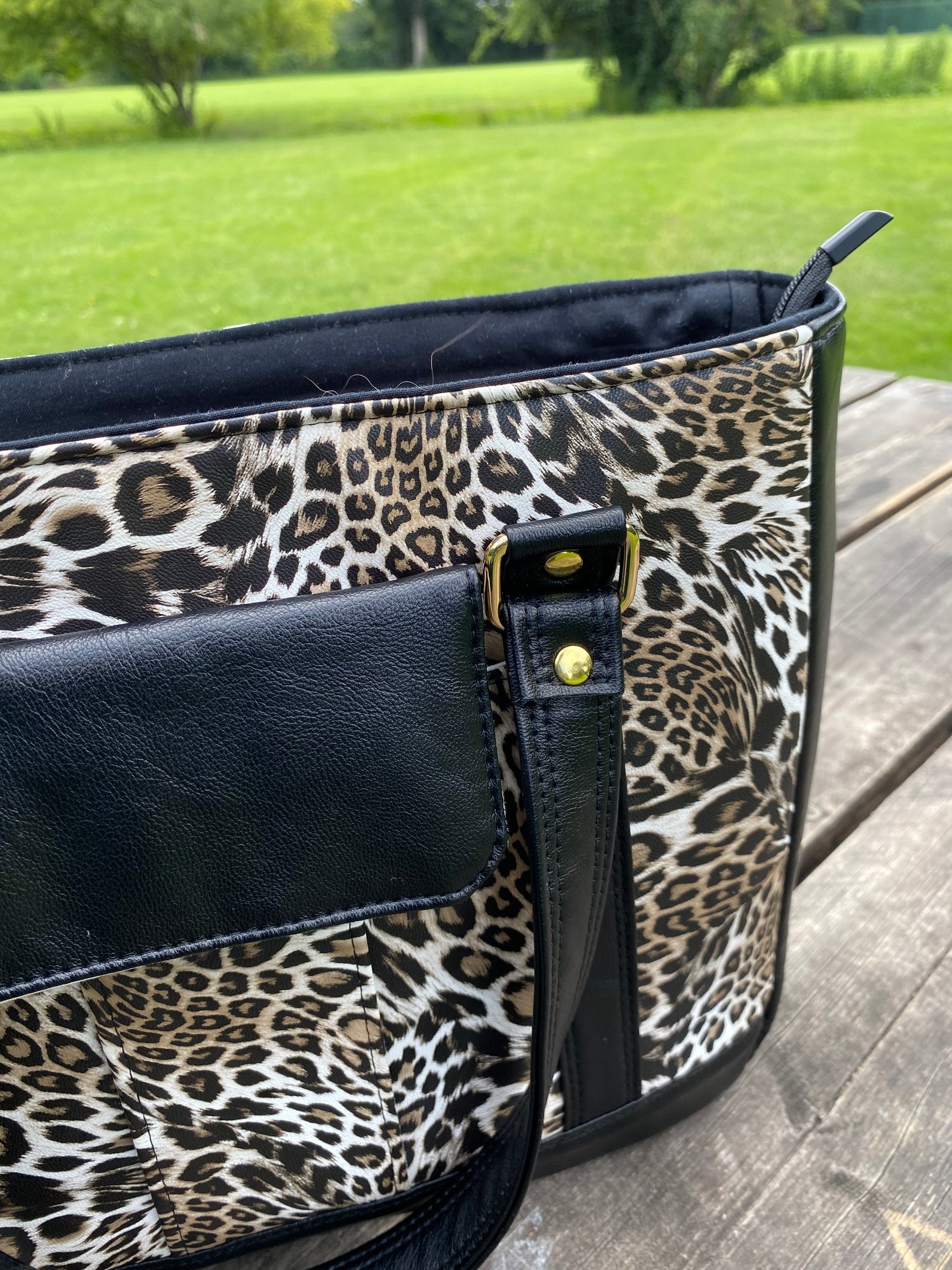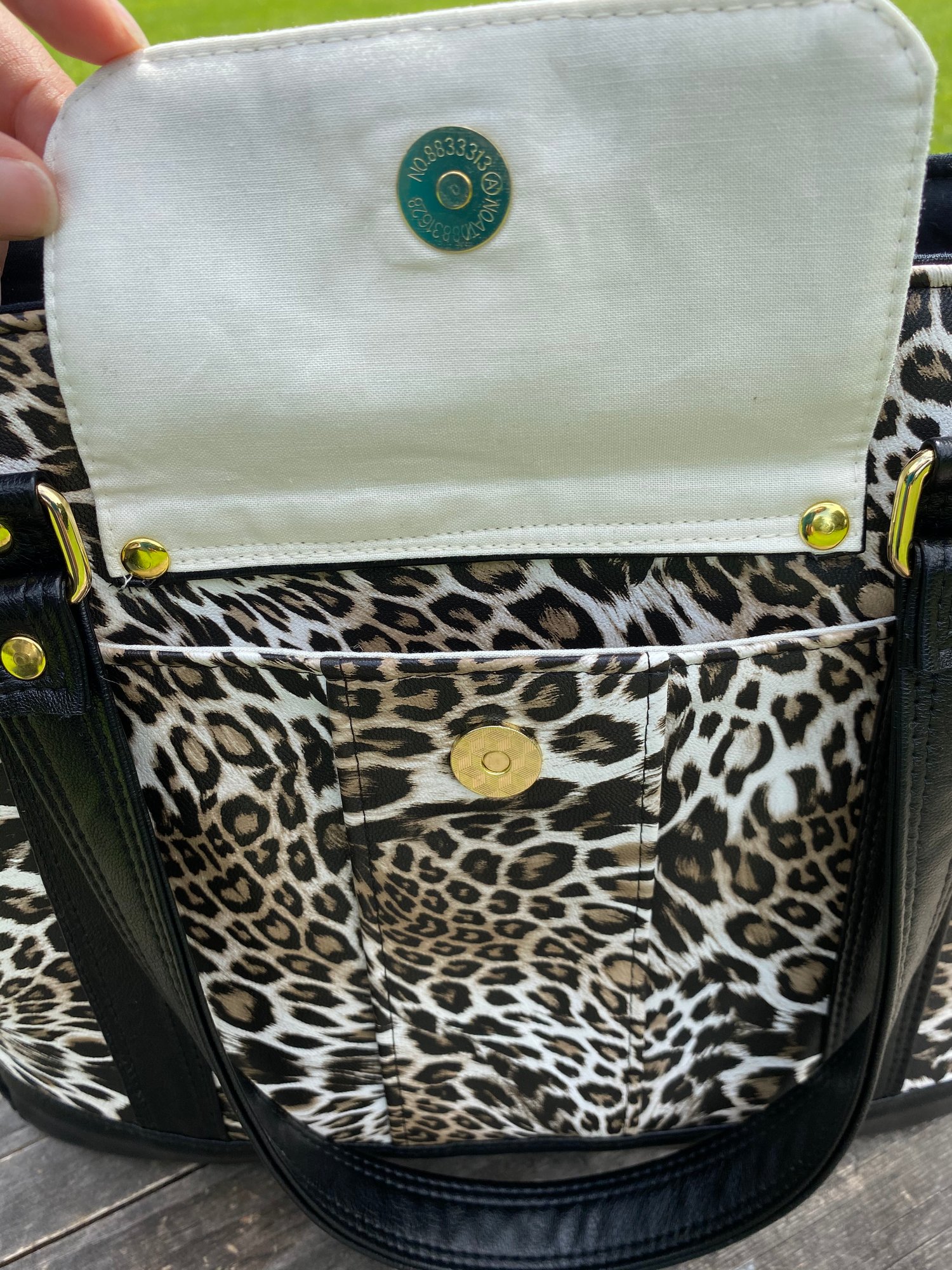 Turn heads while staying organized with this handmade faux leather leopard print tote, designed for both style and function! Key features include: