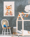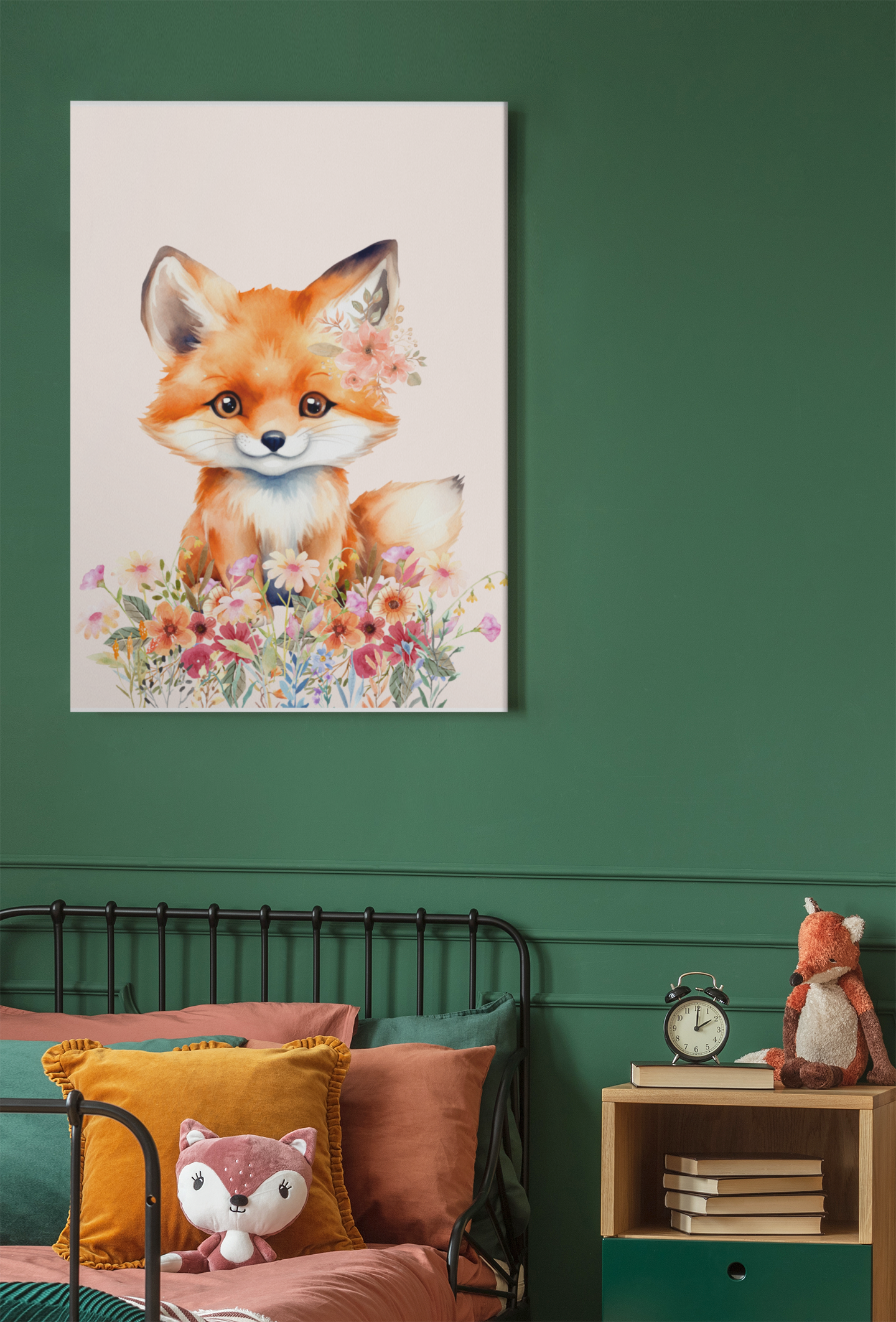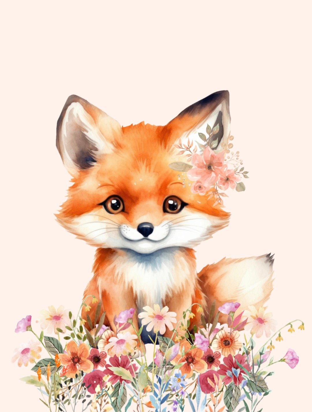This soft watercolor fox with floral accents brings a peaceful woodland vibe to a child’s room..