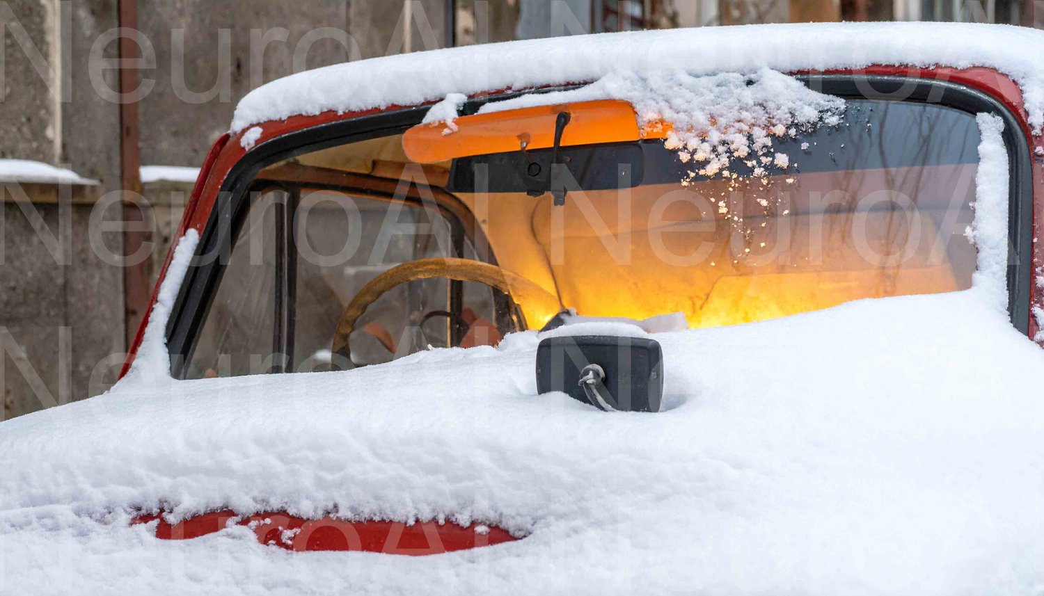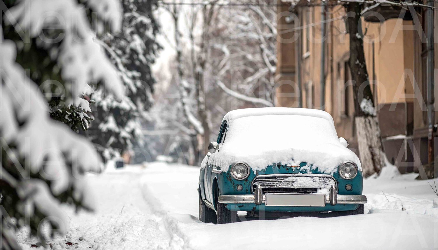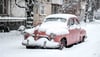 Vintage car sits covered in fresh winter snow