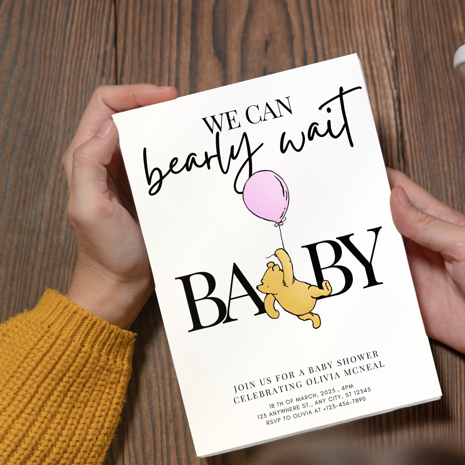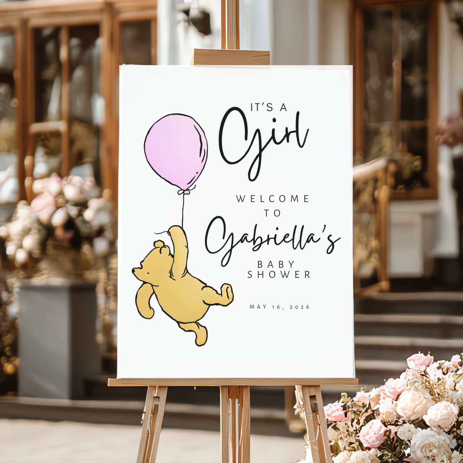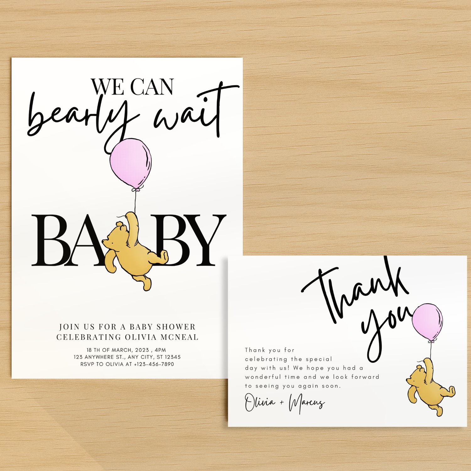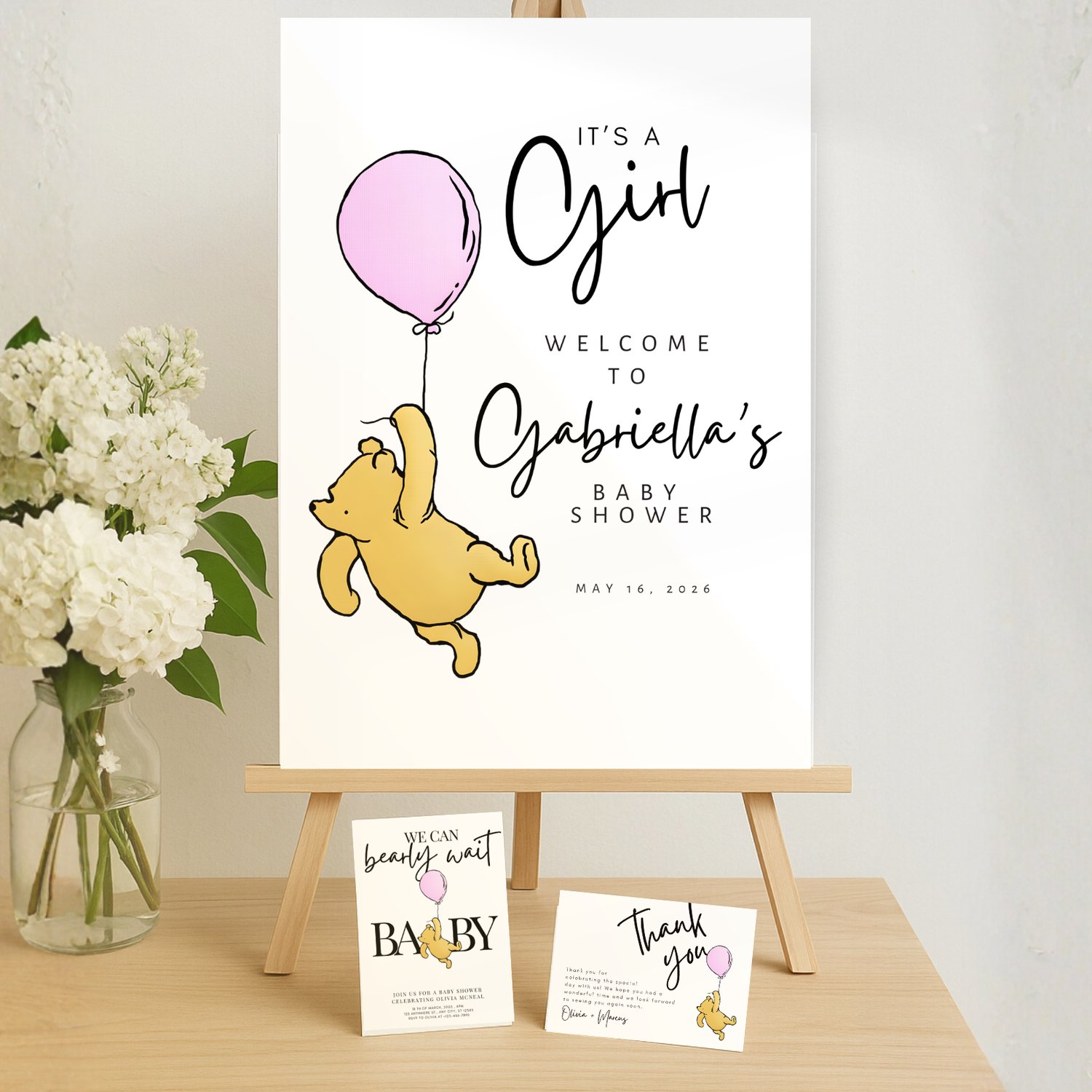Bring the timeless charm of Winnie the Pooh to your celebration with this editable baby shower bundle — featuring a matching invitation, welcome sign, and thank you card in a soft, storybook-inspired design.