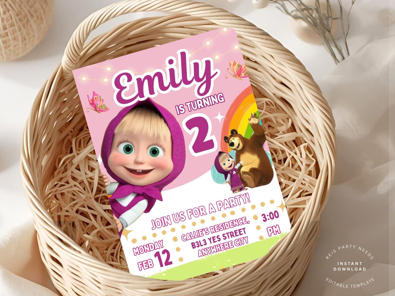 Editable Masha and the Bear Birthday Invitation - Pink Rainbow Girls 2nd Birthday Party Invite - Instant Download Canva Template - Printable 5x7 Card