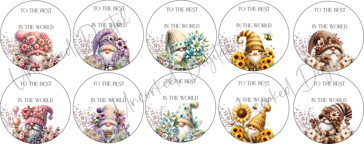 Round resizable floral gnomes, 2 gnome designs in 5 colour options, these come with the text "The best mum in the world" and "The best ..... in the world" giving you the choice to add other titles.