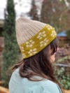 This hat features ~funky~ ⚘floral⚘ stranded colorwork adorning a comfy folded brim, with a switch to fun and simple broken colorwork rib for the body of the hat. While the stranded colorwork may seem intense, due to the construction there is no need to catch floats in this pattern, and the switch to easier textures makes for an engaging knit. Short video demonstrations are included for picking up and knitting the brim stitches, as well as for ensuring loose floats in the stranded colorwork.