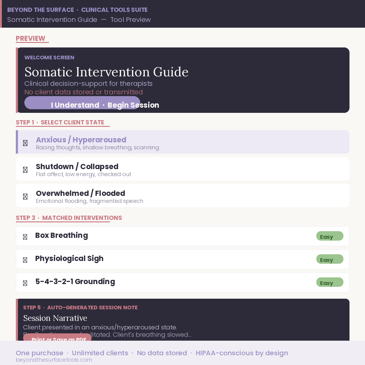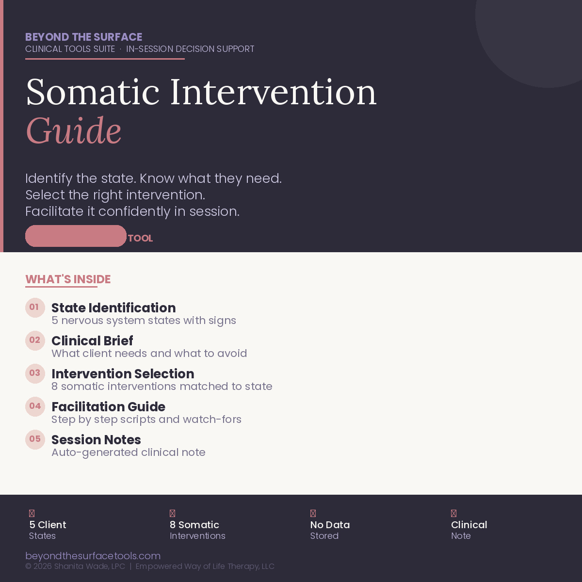 You know something is happening in the room right now. Your client is activated, shut down, flooded, or dissociated. This tool helps you identify exactly what state they are in, understand what they need in this moment, and choose and facilitate the right somatic intervention with confidence.