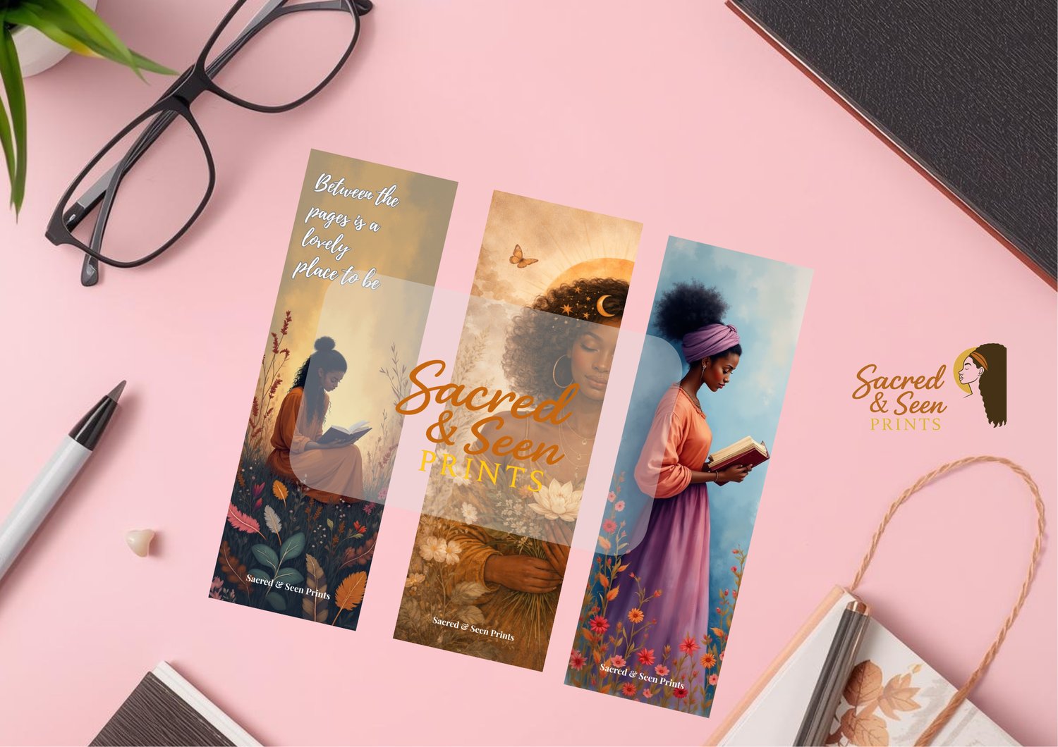 Together, these bookmarks transform everyday reading into a sacred ritual — a reminder that slowing down, dreaming deeply, and seeing yourself reflected matters. Each design centres warmth, cultural beauty, and presence, making this trio a meaningful companion for books, journals, and reflective moments.
