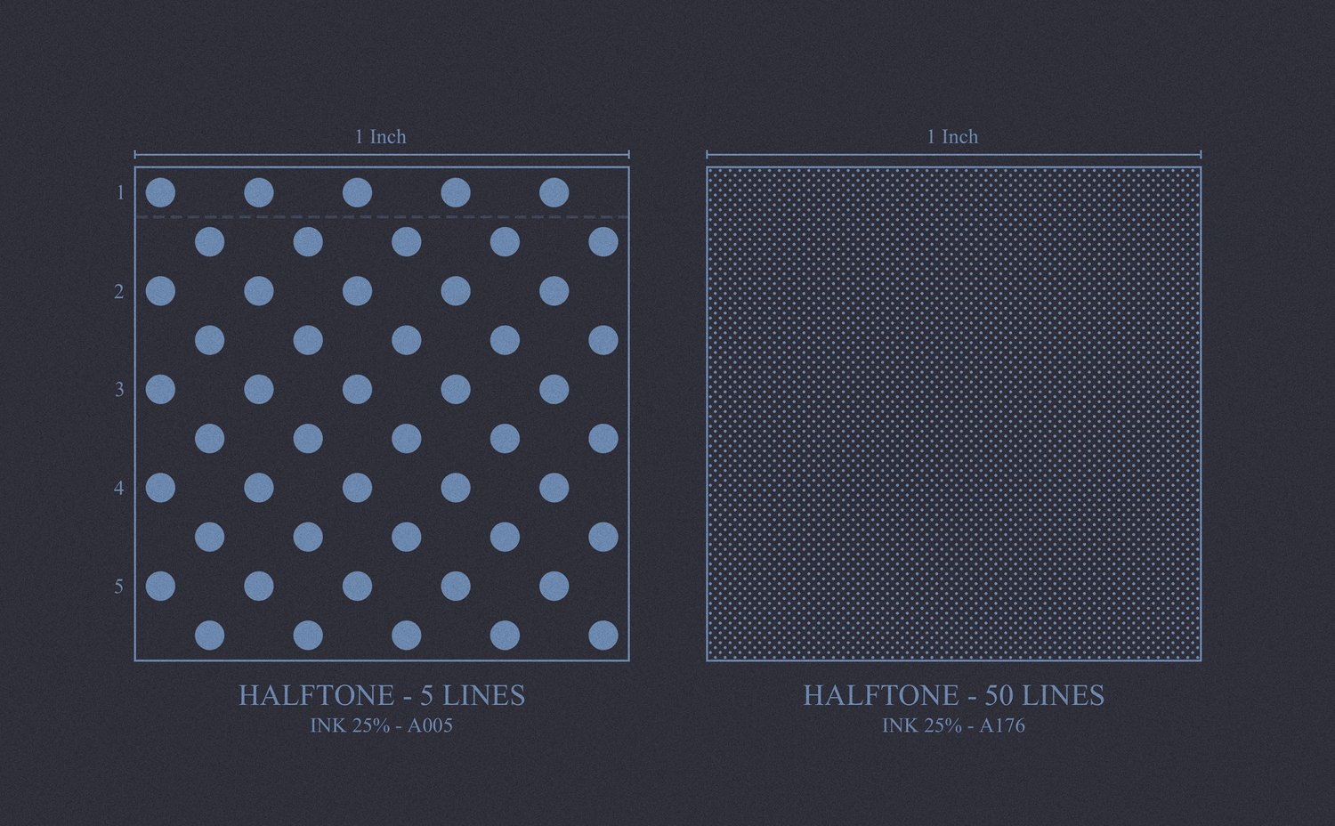The number of lines corresponds to the number of dots in each row or column, the percentage is the amount of ink injected per inch equivalent to the grayscale. This method was implemented to reduce costs by printing only with black ink; when the dots are small enough, an optical illusion is created in which the eye interprets the patterned areas as a smooth grayscale.