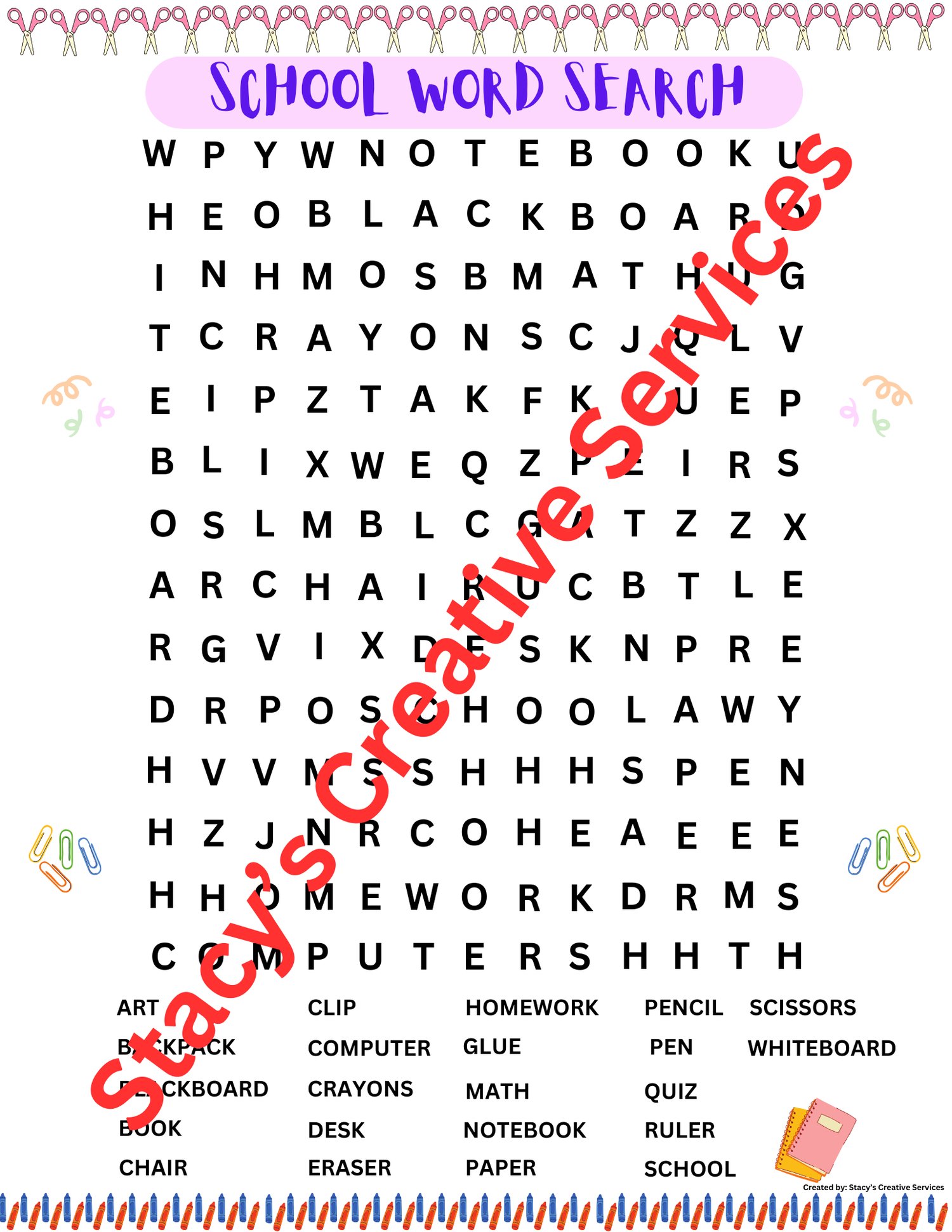 Discover the exquisite School Word Search, meticulously crafted by Stacy's Creative Services. Allow yourself a moment of tranquility as you engage with this delightful puzzle, soothing your mind and inspiring peace. I sincerely appreciate your support. God bless you.