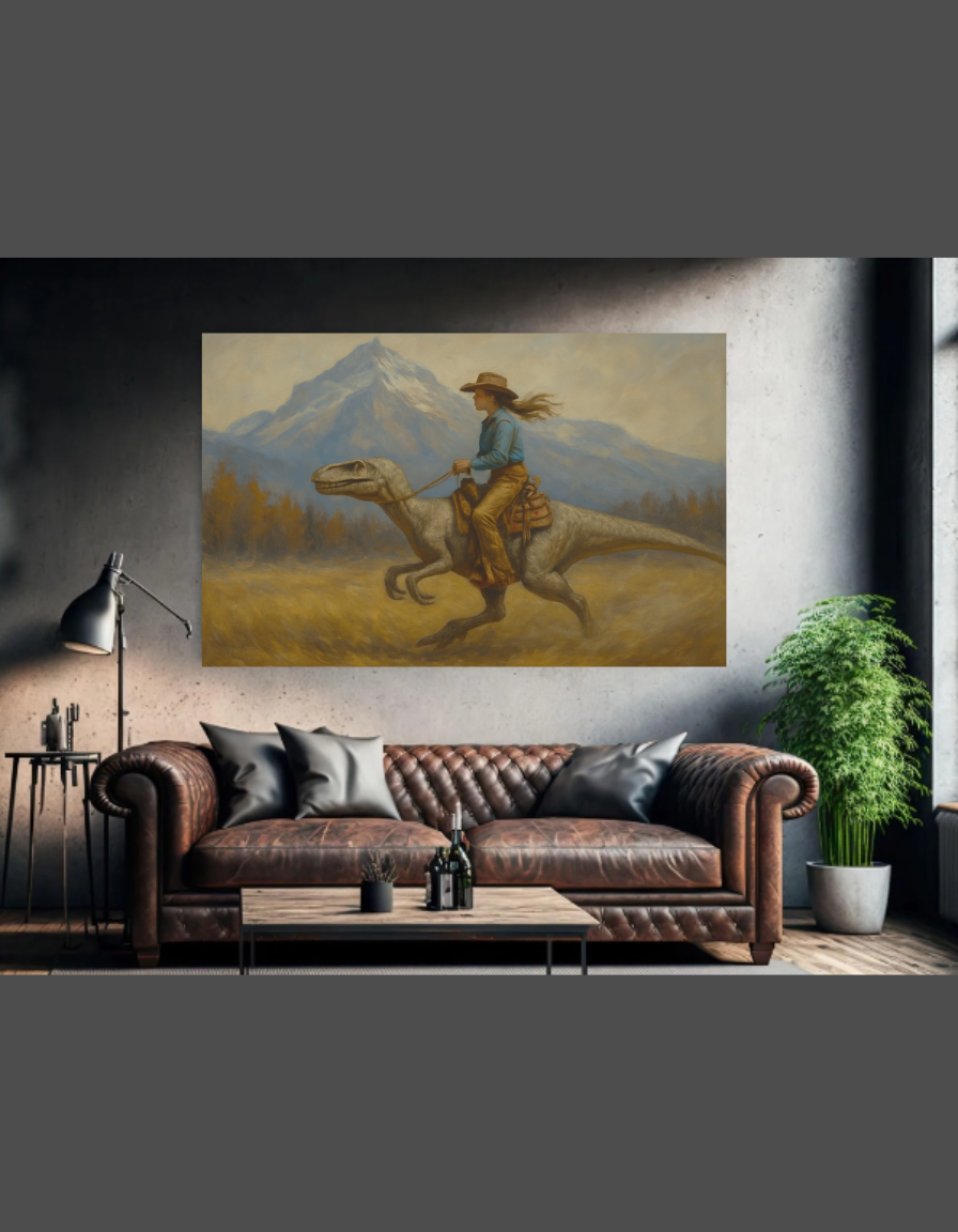 - Theme: Dinosaur Cowgirl print, Vintage T-Rex Poster, Jurassic Western.