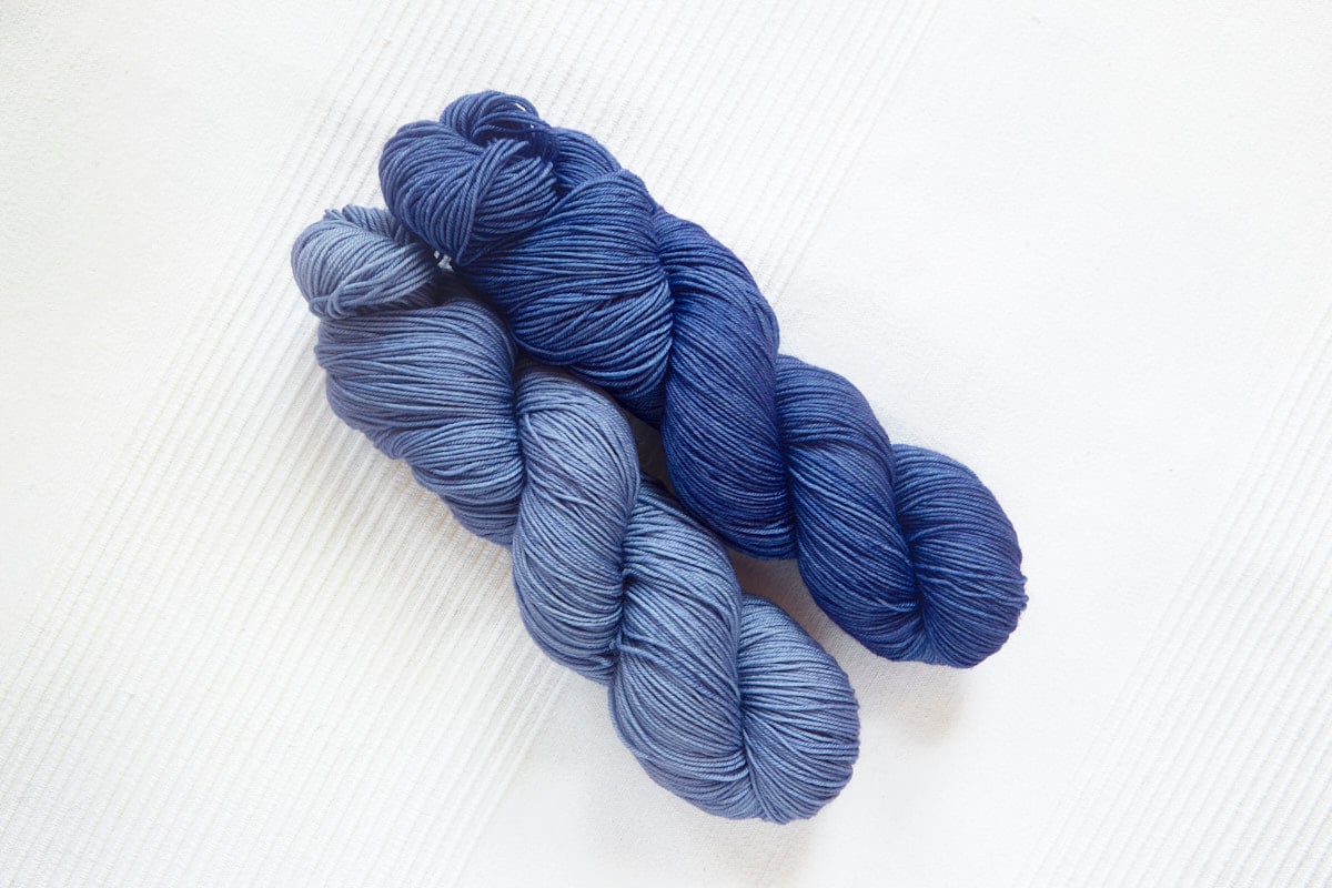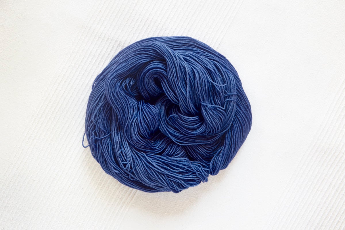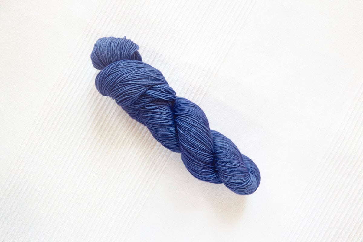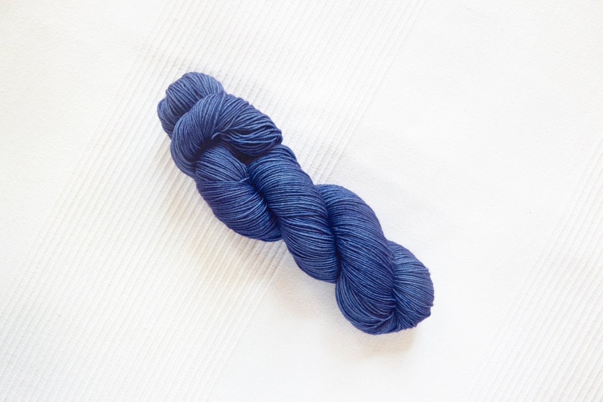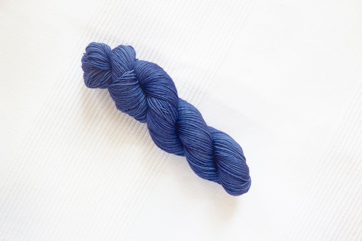 Swallow (Fingering) in colorway: Iris. Semi-solid. Medium-dark purplish blue with slight tonal variation