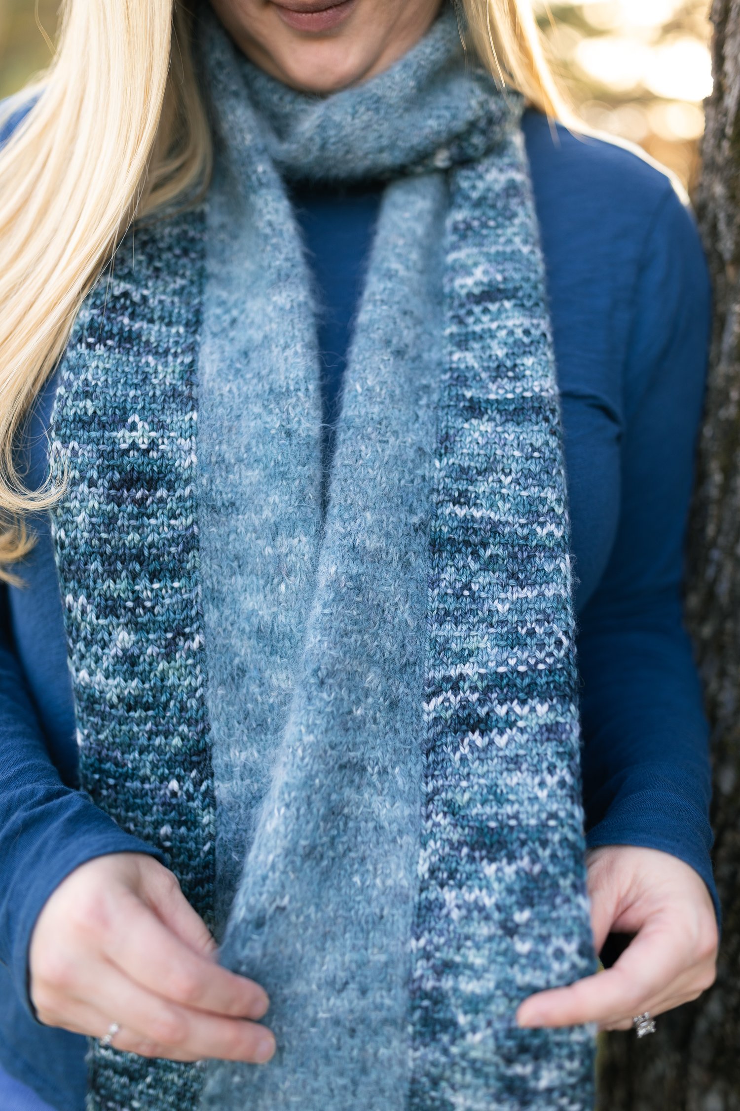 This scarf is made using intarsia sections designed to be approachable and easy to follow, making it an excellent first project for knitters looking to try intarsia without complexity.