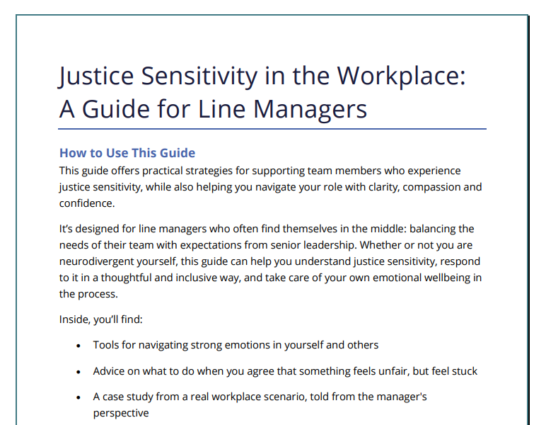 Line managers often find themselves caught between the needs of their team and the expectations of senior leadership. This practical, neuroaffirming guide explores how to navigate justice sensitivity in the workplace, both in yourself and others, with empathy, clarity, and confidence.