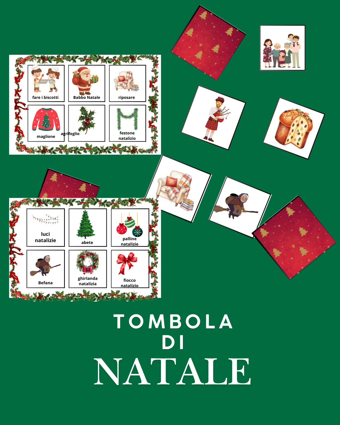 La tombola si collega alle 48 flash cards di Natale che raccontano parole e tradizioni natalizie, dall’albero ai dolci, da Babbo Natale ai folletti, fino alle feste di Capodanno ed Epifania.