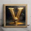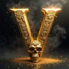 The letter V gold maya skull Skull-inspired engravings, hyper-realistic rendering. Mystical atmosphere with subtle smoke effects. Perfect for high-end typography and design projects. GoldTypography LuxuryDesign SkullArt"
