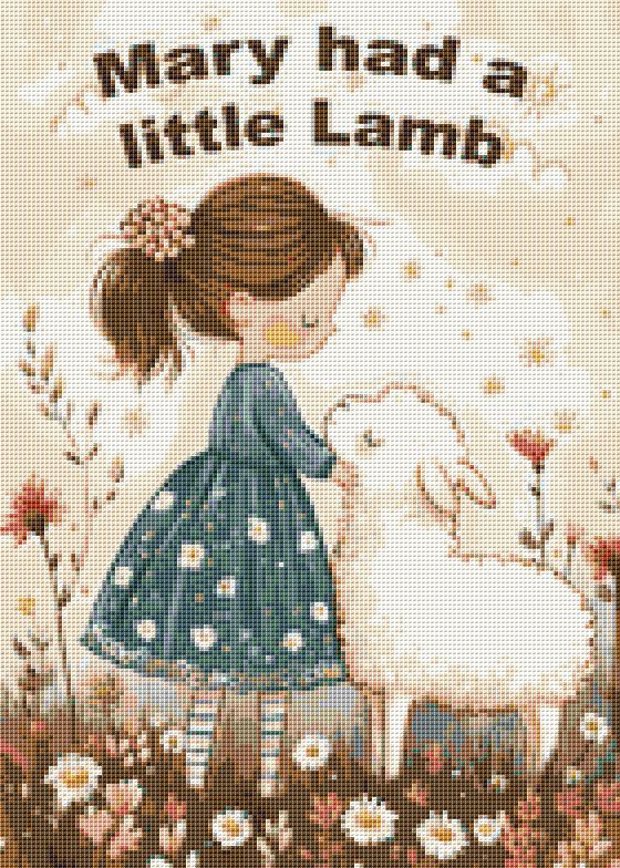 Stitch a timeless childhood classic with this gentle and heartwarming “Mary Had a Little Lamb” cross stitch pattern. Featuring Mary in a sweet floral dress standing beside her loyal lamb among meadow flowers, this storybook-inspired design feels soft, nostalgic, and comforting. The muted vintage palette and charming details make it a relaxing project and a beautiful choice for nursery décor or children’s spaces.