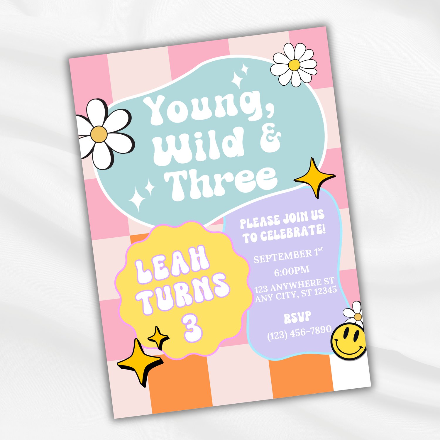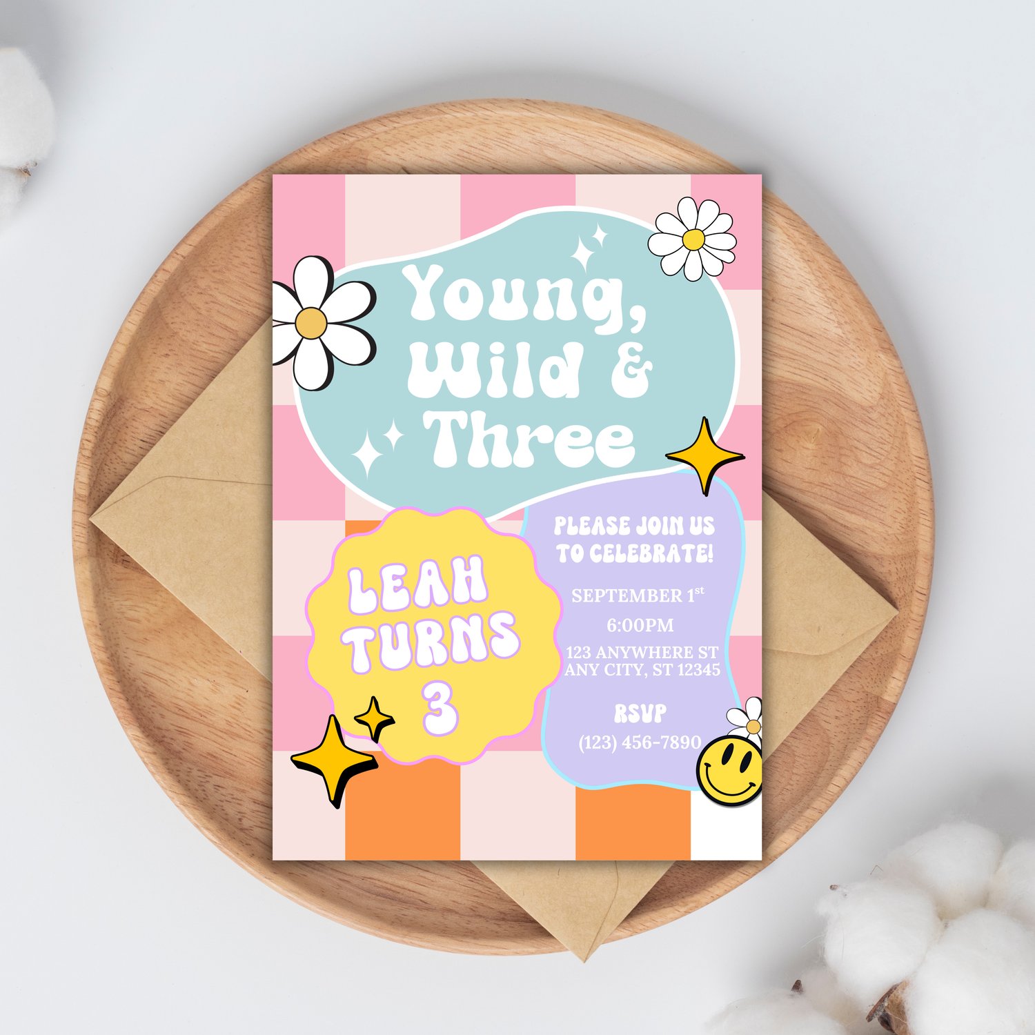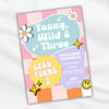 Get groovy and celebrate in style with this retro "Young, Wild, & Three" birthday invitation template! Featuring fun daisies, pastel colors, and a playful 70s-inspired design, this invitation is perfect for your little one’s 3rd birthday celebration.