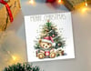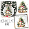 Cute little teddy bear with hot chocolate, Sitting in front of tree with his presents