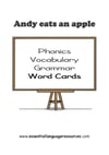 Sentences are simple but complete and usually include a character (ex. “Andy”) that does an action (“eats”) with something (“an apple”) in a specific location (“in the attic”). The sentences contain nouns and verbs, and places are used with common prepositions. Questions can also be asked (“Who is taking the duck to the dam?”) to teach students to identify keywords in a sentence and apply those words to appropriate answers.