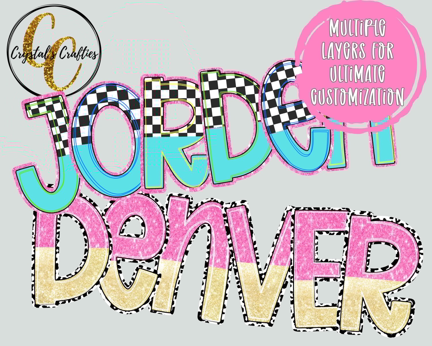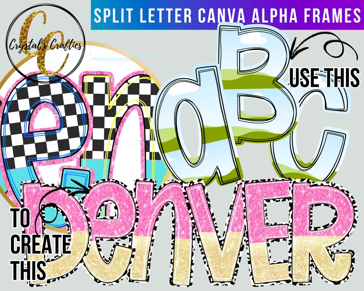 Each letter frame is split into two sections, allowing you to place one pattern or color in the top half and a different pattern or color in the bottom half—perfect for trendy mixed-pattern designs, school spirit graphics, custom apparel, and digital products.