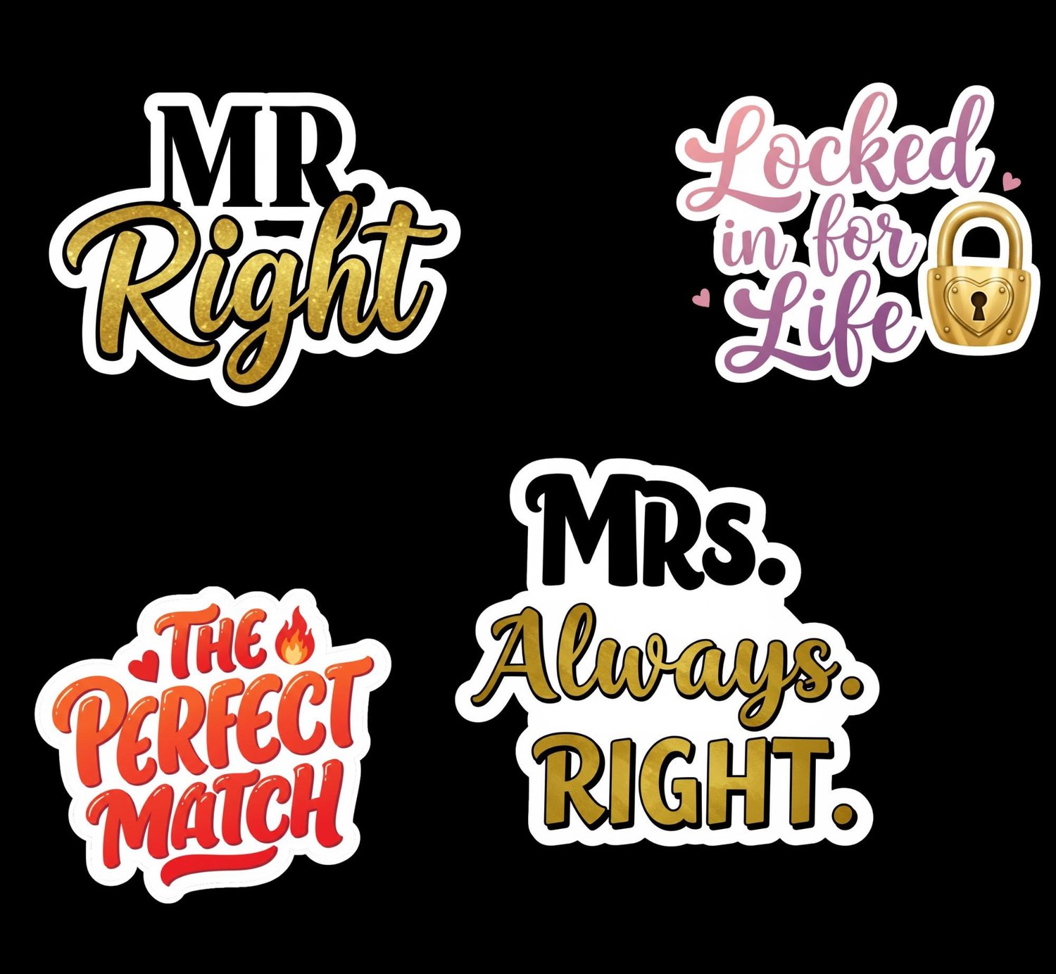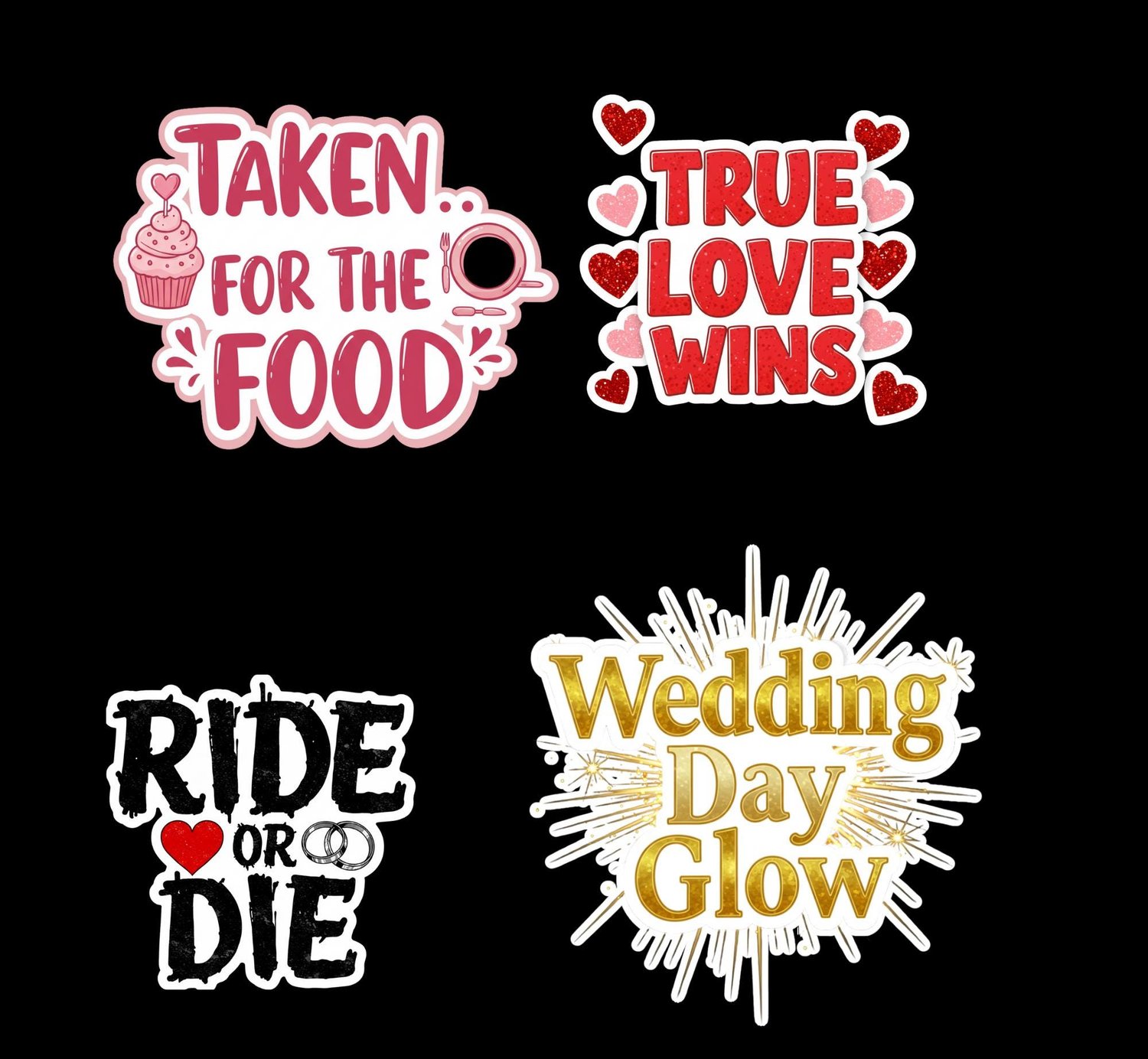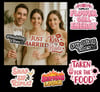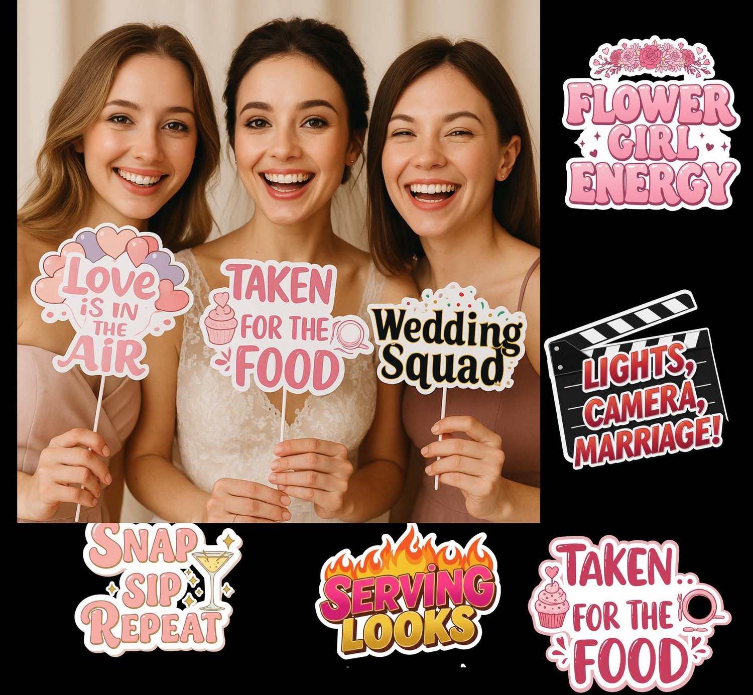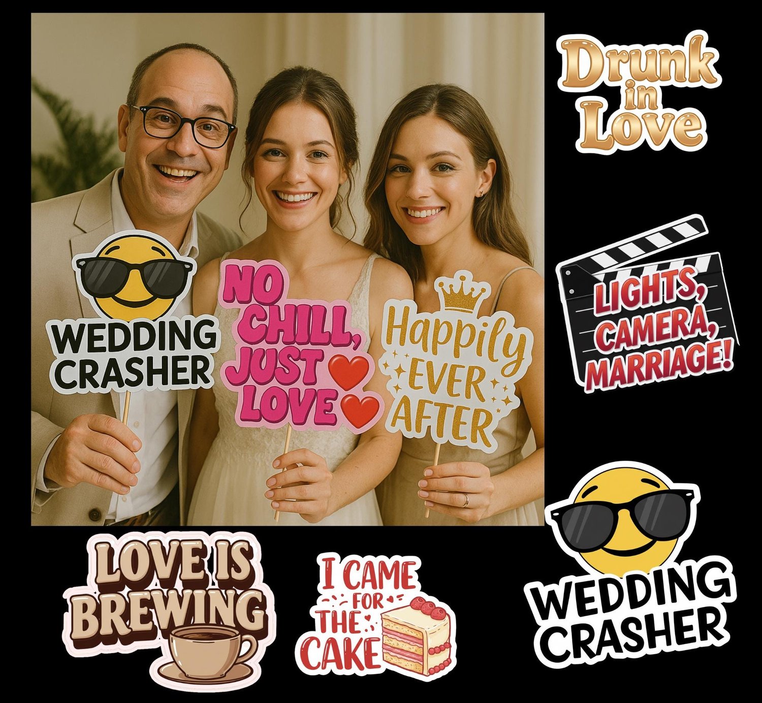 Perfect for capturing fun memories, these printable wedding props include romantic quotes, bridal party humor, and trendy sticker-style designs. Whether you're celebrating love with elegant flair or throwing a full-on reception bash, these wedding photo booth signs are a must-have! Ideal for bridal parties, receptions, and DIY wedding photo booths.