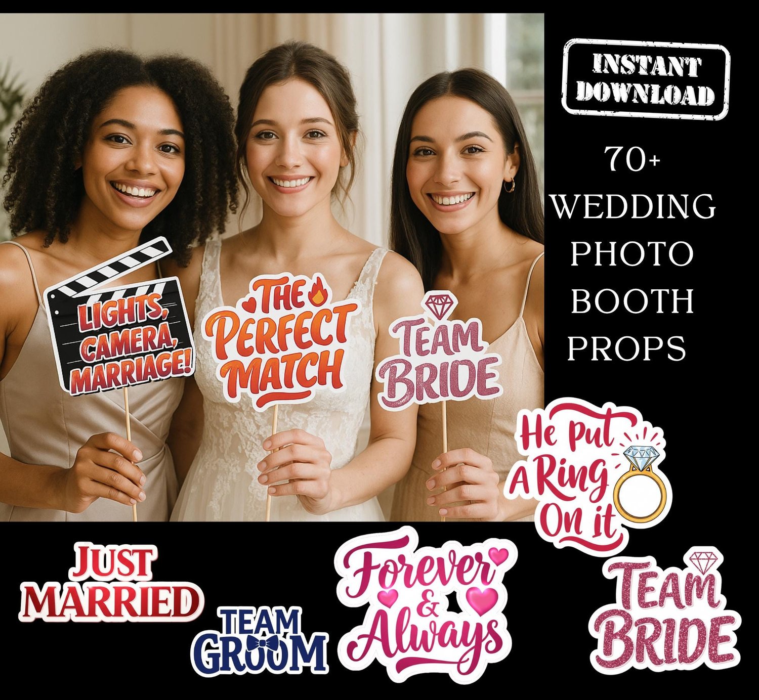 Wedding Photo Booth Props, 70+ Funny Bride Groom Reception Party Decor, Printable Weddine Party Props PNG, Romantic Wedding Selfie Props