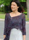 Construction is top-down, and begins with a modified garter tab CO that helps eliminate the “point” that often develops in top-down crescent shawls. After working in stst for a while, stitches for the sleeves are placed onto waste yarn, underarm sts are cast on, and the body of the shawl is worked to the (charted and written-out) lace hem. The sleeve sts are then placed onto double pointed needles and worked in the round to the cuff.