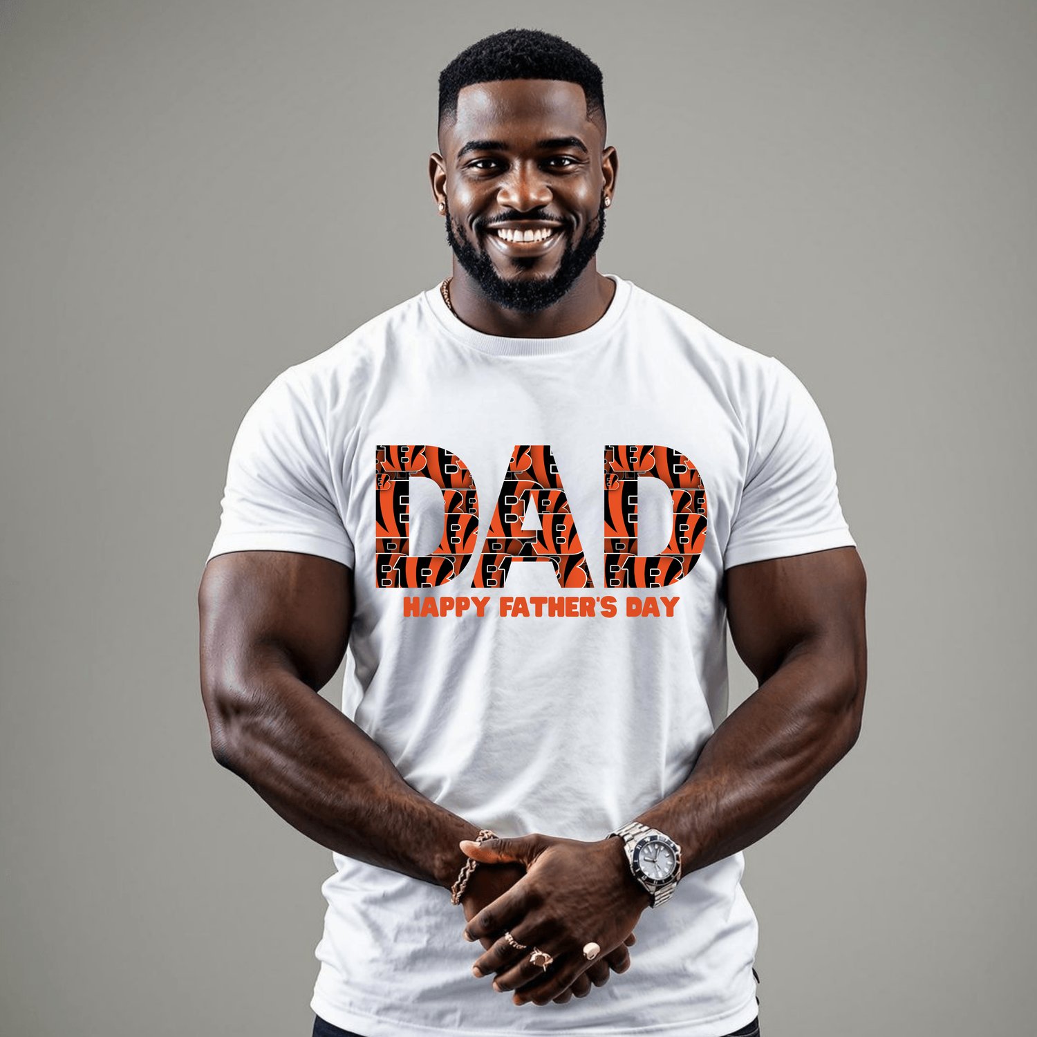 Celebrate Father’s Day with team spirit! This bold Cincinnati Bengals inspired “DAD” design is perfect for football fans and proud fathers alike. Featuring the iconic orange-and-black theme with “Happy Father’s Day” text, this high-resolution PNG file is ideal for crafting T-shirts, mugs, tumblers, and more.