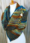 Teal and gold shawl uses one skein each of Malabrigo Mechita in Teal Feather, Diana and Glitter.