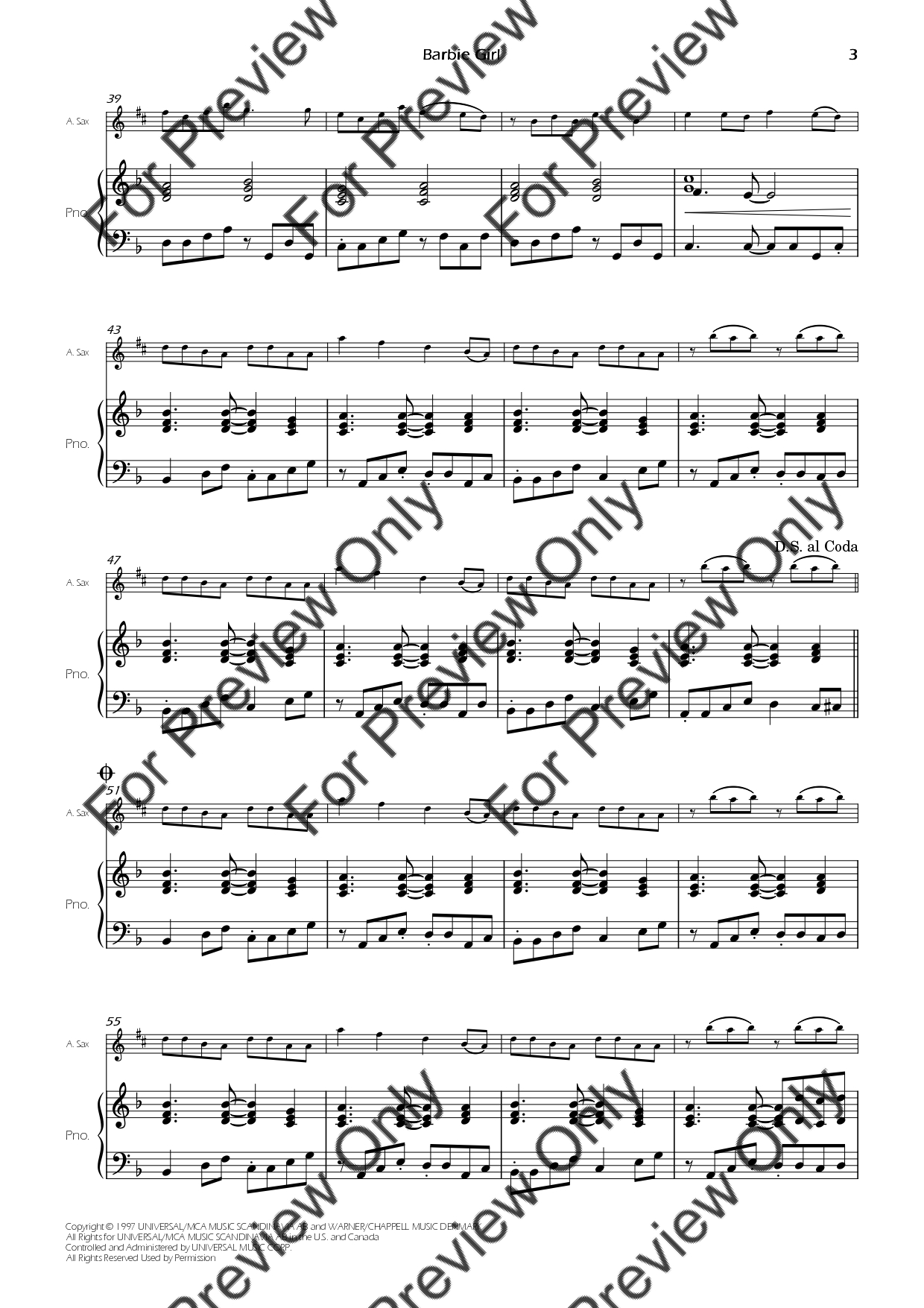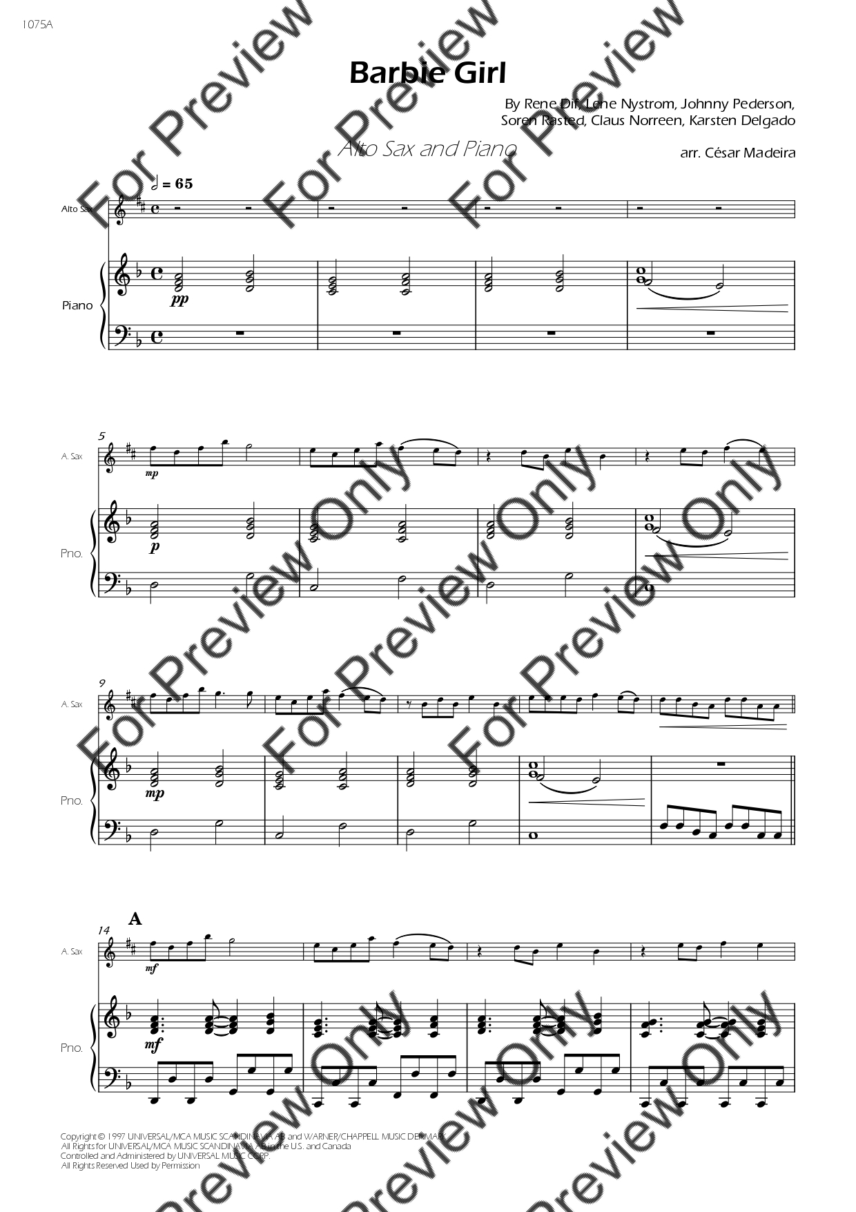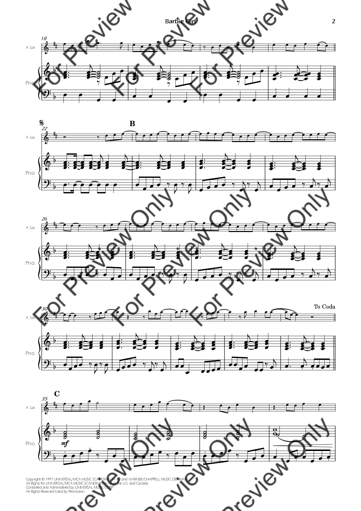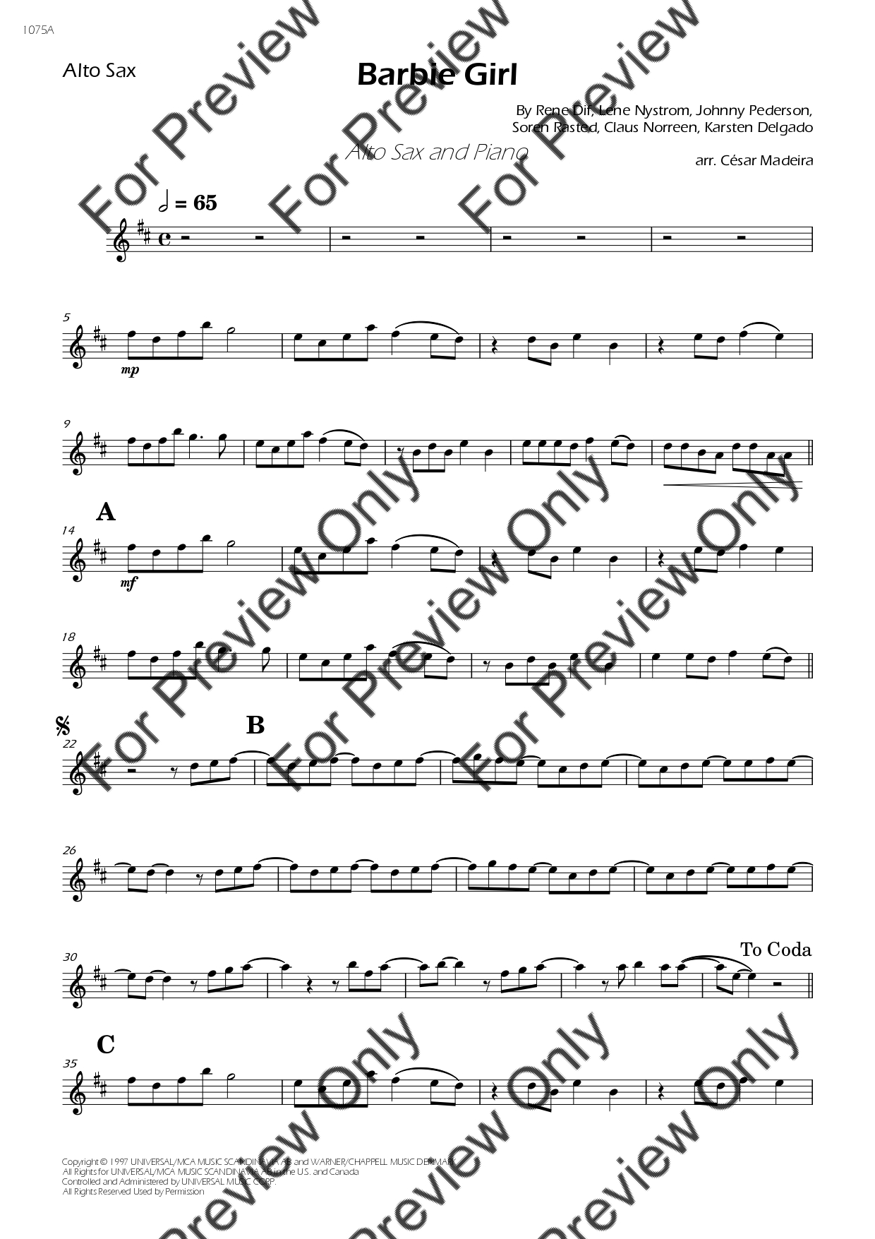 I'm A Barbie Girl from Barbie Girl by Aqua. Arrangement for Alto Saxophone and Piano. With Full Score and Individual Parts. Have fun!