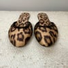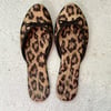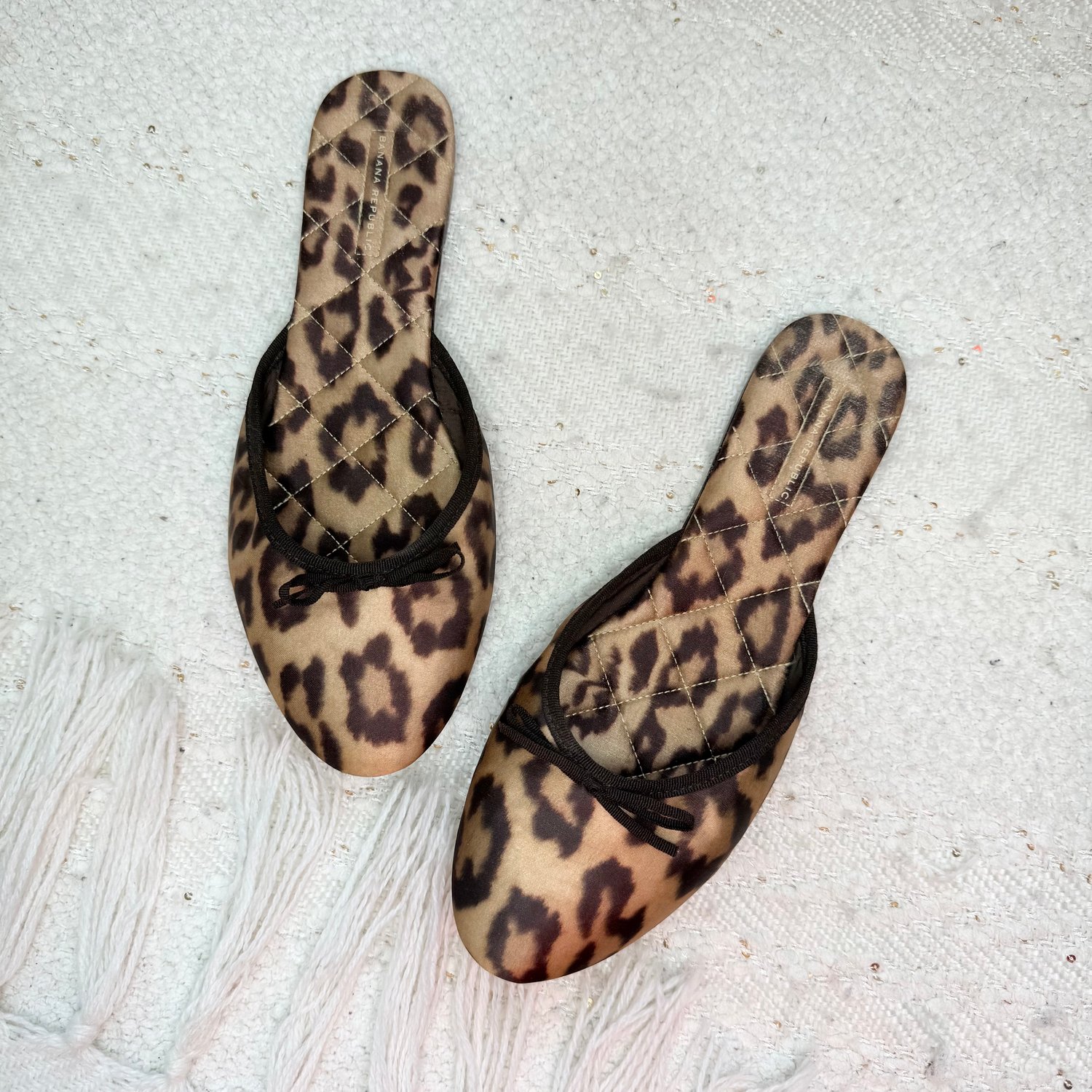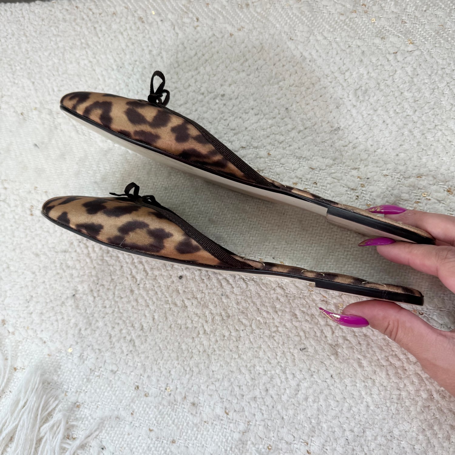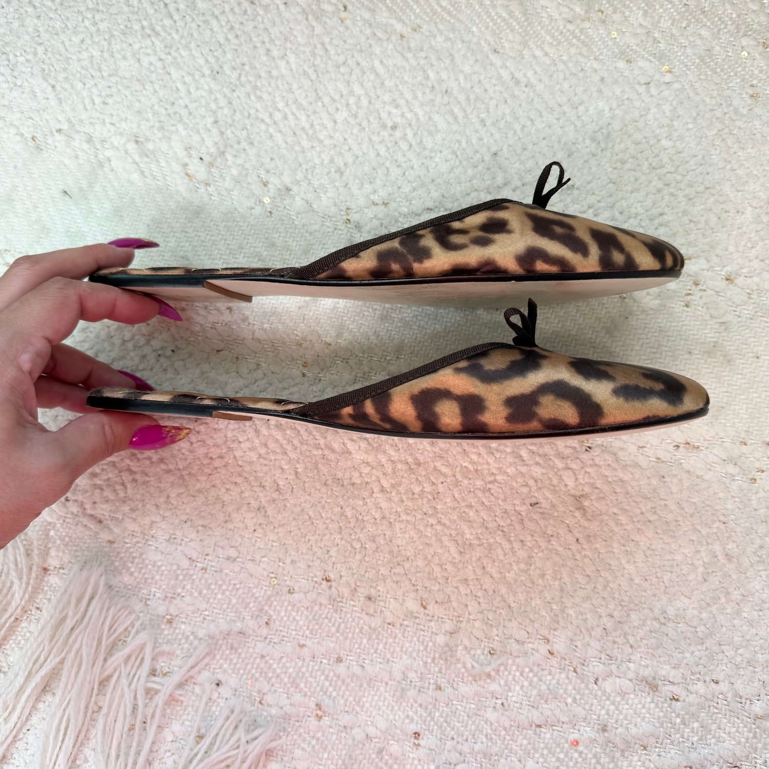 Banana Republic brown and black cheetah print satin-like material outdoor slipper style slides with hard leather soles.
