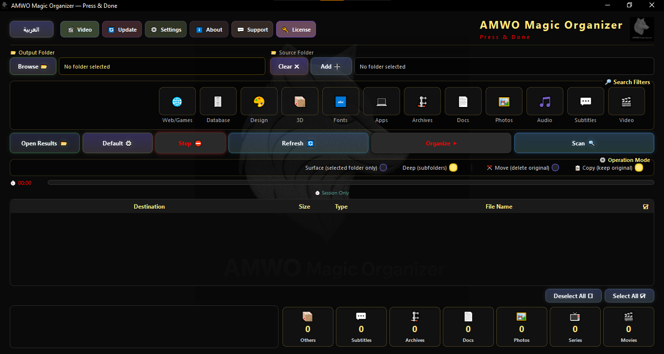 Built with a sleek dark interface in AmeerWolf's signature gold-and-black style, with full Arabic and English support. No technical knowledge required — just pick your folder, hit Organize, and let AMWO do the rest.