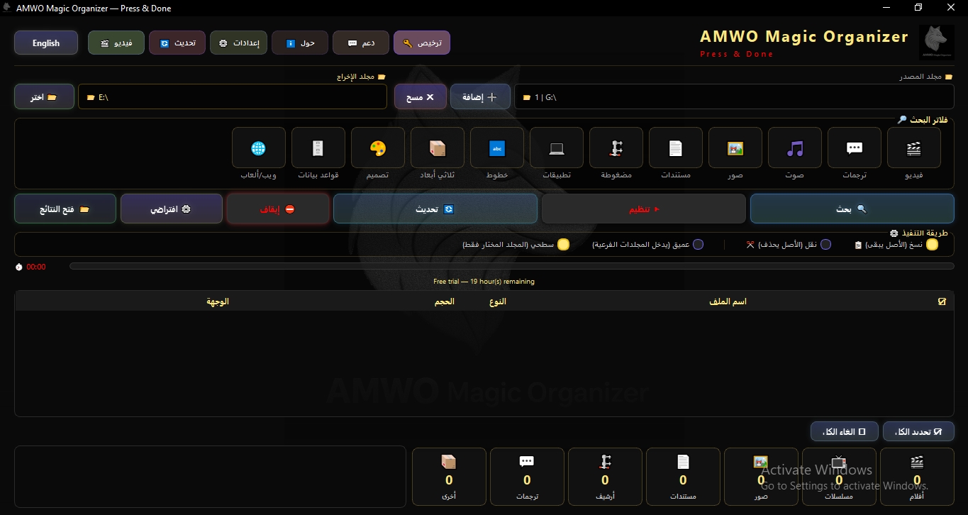 هل تعبت من البحث عن ملفاتك وسط الفوضى؟ AMWO Magic Organizer يحل هذه المشكلة نهائياً. البرنامج يفحص مجلداتك بعمق، يتعرف على الأفلام والمسلسلات والصور والمستندات، ثم يرتبها تلقائياً في هيكل منظم واحترافي — كل شيء في مكانه الصحيح.